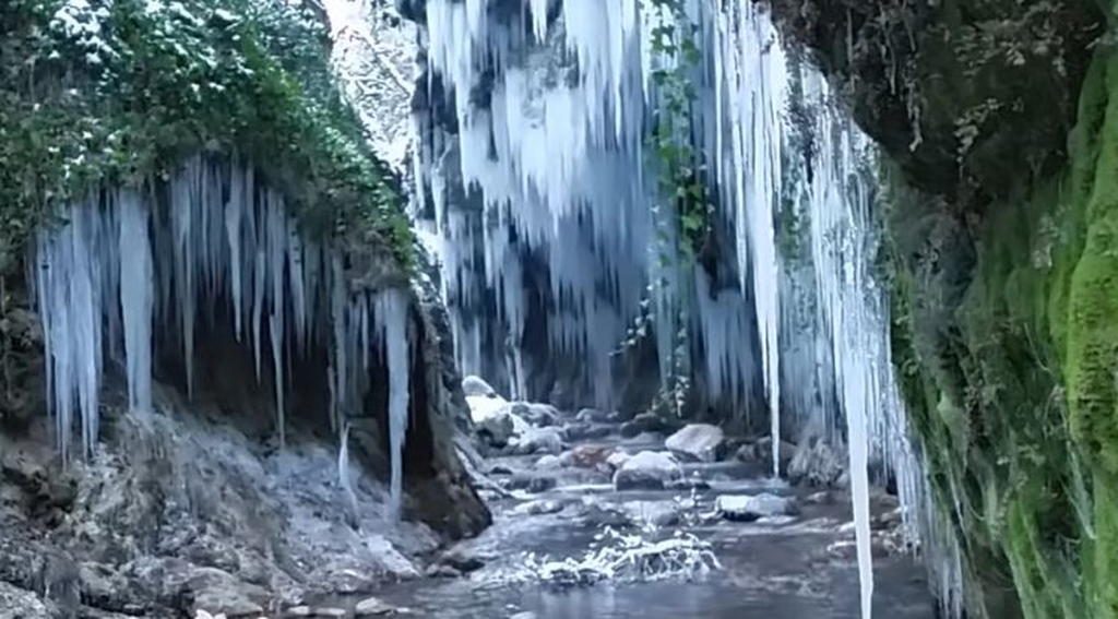 Οφείλει την περίεργη ονομασία του στα παγωμένα νερά που έρχονται από το απόκρημνο βουνό της Καλιακούδας, κυλούν από τις κορυφές του φαραγγιού και στην πορεία τους δημιουργούν πανέμορφους καταρράκτες.