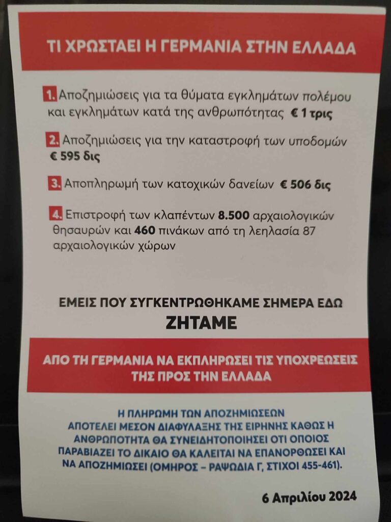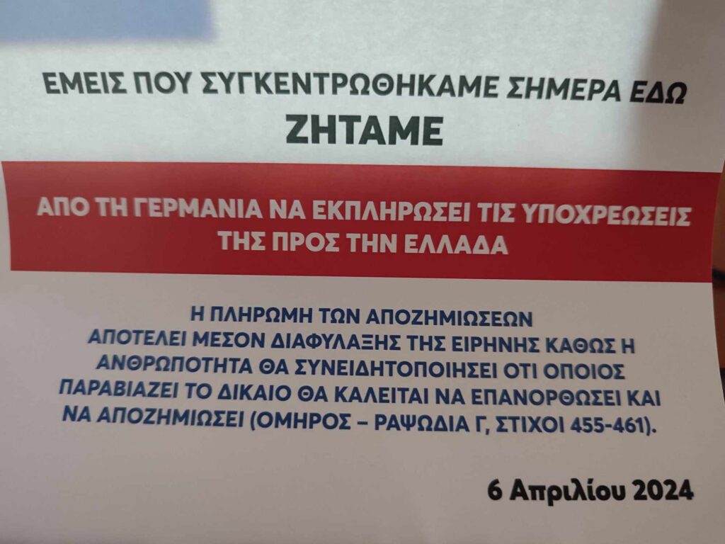 Έγκλημα και τιμωρίαΔιαμαρτυρία έξω απ΄τη Γερμανική πρεσβεία στην ΑΘΗΝΑ Πέτρος Ιωάννου2 έτη ago2 έτη ago01 mins Περί τους 150 νοματαίους υπολόγισα, καλή προσέλευση σε καιρούς ”αμνησίας” λήθης και ύπνωσης γενικευμένης Αθήνα 6/4/2024 Πλοήγηση άρθρων Previous: Βασίλης Λέκκας: «Να ‘χα χίλια χέρια»Next: Σκίτσο του Ηλία Μακρή (04/04/24) Αφήστε μια απάντηση Ακύρωση απάντησηςΗ ηλ. διεύθυνση σας δεν δημοσιεύεται. Τα υποχρεωτικά πεδία σημειώνονται με *Σχόλιο * Όνομα * Email * Ιστότοπος Αποθήκευσε το όνομά μου, email, και τον ιστότοπο μου σε αυτόν τον πλοηγό για την επόμενη φορά που θα σχολιάσω.
