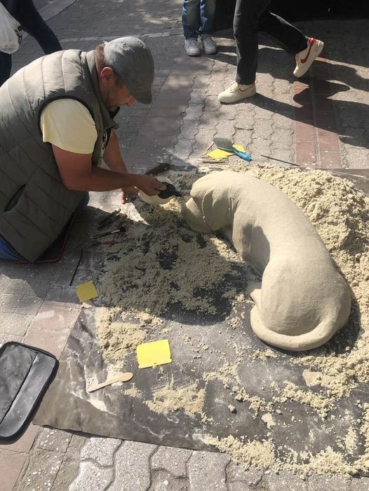 Ο καλλιτέχνης άφησε τη πατρίδα του τη Ρουμανία και περνά κι από εδώ για το μεροκάματο… Ένα σακί κοσκινισμένης άμμου, ένα φυσερό σπρέι νερού, φαντασία, δεξιοτεχνία και ο γλυπτός σκυλάκος έτοιμος. Με τους περαστικούς να θαυμάζουν και να ενισχύουν τον υπαίθριο καλλιτέχνη.