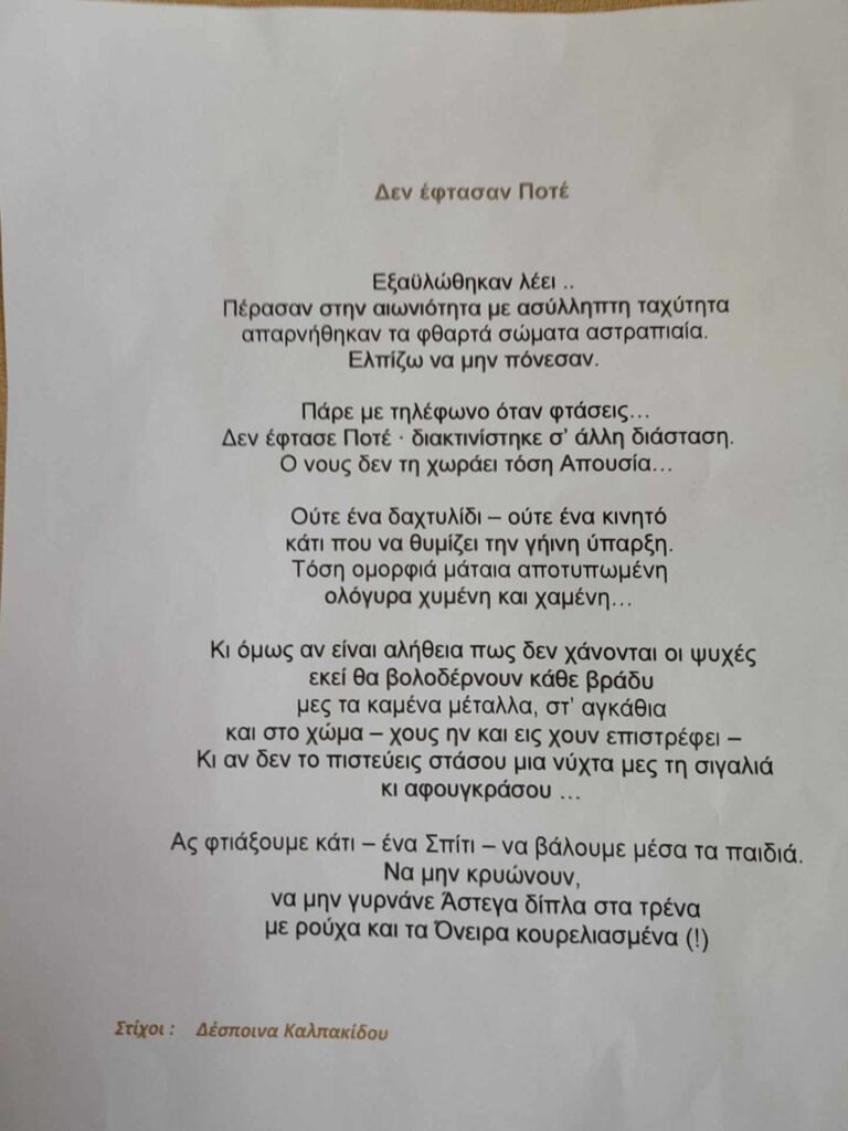 Πόσα ευχαριστώ πρέπουν στην οικοδέσποινα της βραδιάς και του Πολυχώρου Εβελίνα Πρεβέντη, στους Καλλιτέχνες για τη δουλειά τους και τη συμπαράσταση, στην ήρεμη δύναμη Μαρία Καρυστιανού που με συνέπεια κρατά αμείωτη την οργή των πολιτών, τους Ερυθροσταυρίτες και τη συνάδελφο Δέσποινα Καλπακίδου για το ”Δεν έφτασαν ποτέ…”;