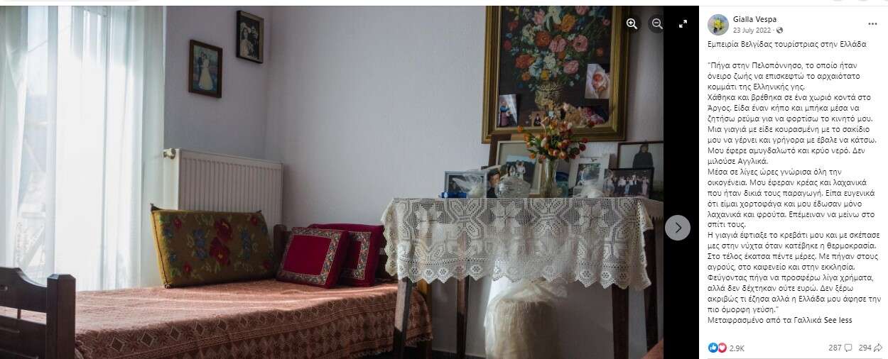 Η γιαγιά έφτιαξε το κρεβάτι μου και με σκέπασε μες στην νύχτα όταν κατέβηκε η θερμοκρασία. Στο τέλος έκατσα πέντε μέρες. Με πήγαν στους αγρούς, στο καφενείο και στην εκκλησία. Φεύγοντας πήγα να προσφέρω λίγα χρήματα, αλλά δεν δέχτηκαν ούτε ευρώ. Δεν ξέρω ακριβώς τι έζησα αλλά η Ελλάδα μου άφησε την πιο όμορφη γεύση.”
