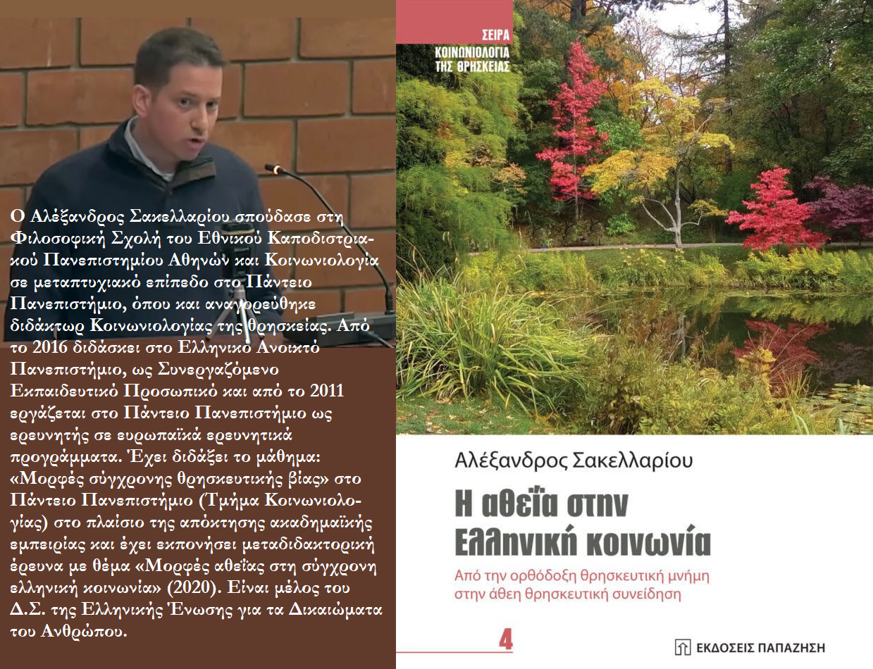 κοινωνιολόγοι. Από την κριτική, δηλαδή, στον θεσμό, όπως για παράδειγμα για μία σειρά από σκάνδαλα στον εκκλησιαστικό χώρο η κριτική πέρασε και στον θεό. Ειδικά για την ελληνική κοινωνία την οποία αφορά το βιβλίο, η κριτική στη θρησκεία και την Ορθόδοξη Εκκλησία ήταν οξύτατη για τα δόγματα και τον δημόσιο λόγο της. Το εντυπωσιακό είναι ότι ιδίως μετά την πανδημία αυτό καταγράφεται σε έρευνες ακόμα και από πιστούς και μέλη της Εκκλησίας με συνέπεια από εκεί που Εκκλησία ήταν, αν όχι πρώτη, στις πρώτες θέσεις αναφορικά με την εμπιστοσύνη στους θεσμούς πλέον να εμφανίζεται κάτω από τη μέση ή και στις τελευταίες, όπως συνέβη στην πανδημία. Μία δεύτερη κατηγορία ανθρώπων είναι εκείνοι που είχαν κάποια αρνητική εμπειρία από το θείο, όπως προσευχές που δεν εισακούονταν ή τον θάνατο ενός πολύ δικού τους ανθρώπου που αγαπούσαν και θεωρούσαν ηθικό. Μία τρίτη, ήταν εκείνη η κατηγορία ανθρώπων που κατά την εφηβεία αμφισβήτησαν τα πάντα και η θρησκεία συμπαρασύρθηκε ως μορφής αυθεντίας και εξουσίας. Τέλος, είναι και εκείνοι που άρχισαν να αμφισβητούν από σχετικά μικρή ηλικία, -όλοι σχεδόν το έκαναν ούτως ή άλλως, νωρίτερα ή αργότερα- το ίδιο το θείο και τις διδασκαλίες της θρησκείας, όπως τη δημιουργία του κόσμου, τα θαύματα, την άμωμη σύλληψη, την ανάσταση, με βάση τη λογική και την επιστήμη, αλλά και την παρουσία του κακού στην κόσμο με βάση την ηθική. Δεν μπορούσαν να δεχτούν δηλαδή ούτε το παράλογο ως μέρος της θρησκείας ούτε το κακό (πόλεμοι, πείνα, καταστροφές, μαζικοί θάνατοι) ως μέρος ενός θρησκευτικού συστήματος αλλά και του ίδιου θεού. Σε κάθε περίπτωση θα έλεγα, με βάση την έρευνά μου τουλάχιστον, ότι συνήθως απαντώνται πλέον του ενός λόγοι στις αφηγήσεις τους.