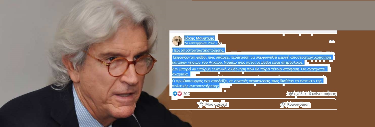 Ο αρθρογράφος, σε ανύποπτο χρόνο, είχε αναρτήσει μήνυμα (24 Σεπτεμβρίου του 2020) το οποίο αποδεικνύεται εξαιρετικά προφητικό: «Εκφράζονται φόβοι πως υπάρχει περίπτωση να συμφωνηθεί μερική αποστρατιωτικοποίηση κάποιων νησιών του Αιγαίου. Νομίζω πως αυτοί οι φόβοι είναι υπερβολικοί. Δεν μπορεί να υπάρξει ελληνική κυβέρνηση που θα πάρει τέτοια απόφαση. Θα ανατραπεί ακαριαία».
