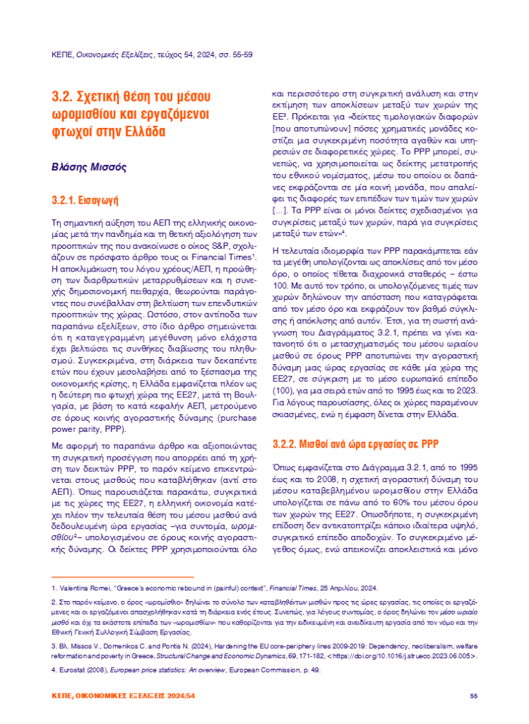 Δεν χωράει αμφιβολία, επισημαίνει ο οικονομολόγος, ότι, σε σύγκριση με τις χώρες της ΕΕ27, η Ελλάδα έχει διέλθει μια μακρά περίοδο περικοπών και στασιμότητας των αμοιβών εργασίας. Οι νέες θέσεις εργασίας που δημιουργούνται αντιστοιχούν σε χαμηλότερες αποδοχές και σχετικά, περισσότερες ώρες εργασίας. Αυτό έχει ως αποτέλεσμα, κατά το 2022, το 23,1% των εργαζομένων (περίπου 1 στους 4) να υπολογίζεται ότι διαβιοί με διαθέσιμο εισόδημα χαμηλότερο του κατωφλιού φτώχειας του 2009. «Το φαινόμενο των εργαζόμενων φτωχών οφείλει να αποτελέσει επίκεντρο της αναπτυξιακής ατζέντας της χώρας και να απασχολήσει εντονότερα την κοινή γνώμη. Η αύξηση της απασχόλησης, μέσα από τη δημιουργία καλά αμειβόμενων και ποιοτικών, θέσεων εργασίας, αποτελεί παράγοντα για τη βελτίωση των συνθηκών διαβίωσης στη χώρα μας», καταλήγει.
