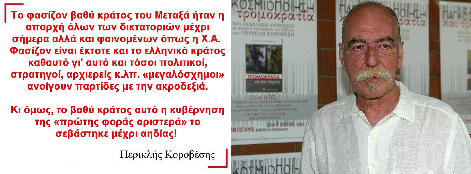 Δύο χρόνια και βάλε, πέρασαν αφότου έφυγε από τη ζωή ο Περικλής Κοροβέσης (11.04.2020) Εμάς, που μας λείπει είναι λογικό να τον νοσταλγούμε. Ουσία λείπει κι σ’ ολάκερη την κοινωνία. Πού τέτοιες φωνές σήμερα… (μερικών εξαιρουμένων, λ.χ. Γιώργος Κοντογιώργης) για να περιφρονήσουν τσιτάτα, κομματικά επιτελεία και ιερατεία, το φασίζον καθεστώς, την φανερή και κρυφή βία, τους συμβιβασμούς, την παγκοσμιοποίηση κ.ο.κ. Επαναφέρω το αφιέρωμα της “ΚΑΘΗΜΕΡΙΝΗΣ” την επομένη του θανάτου του, για να θυμηθούν οι μεγαλύτεροι και να μάθουν οι νεότεροι!