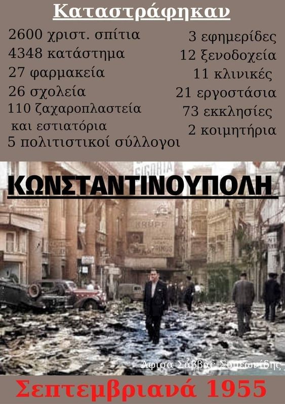 - Μια ημέρα σαν σήμερα, στις 6 Σεπτεμβρίου 1955, στην Κωνσταντινούπολη στήθηκε μια άλλη «Νύχτα των Κρυστάλλων». Θύματα αυτή τη φορά ήταν οι Έλληνες της Πόλης και θύτης το Τουρκικό κράτος το οποίο μια μικρής ισχύος έκρηξη στο σπίτι του Κεμάλ Ατατούρκ στη Θεσσαλονίκη τη μετέτρεψε σε καταστροφική έκρηξη που ισοπέδωσε την κατοικία του Τούρκου ηγέτη.Unmute