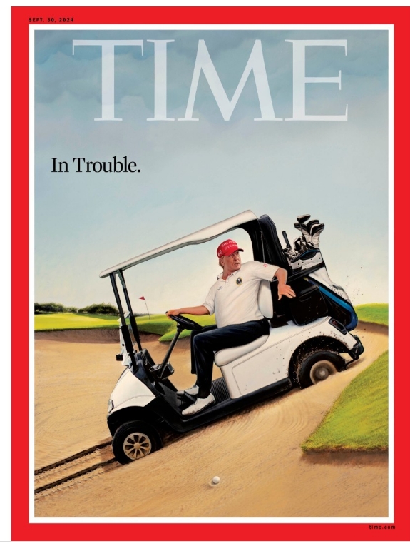 Το αποτέλεσμα του debate, μάλιστα, αποτυπώνεται με τον καλύτερο τρόπο στο εξώφυλλο του περιοδικού TIME, όπου ο Τραμπ διακρίνεται να τρέπεται σε φυγή πάνω στο αγαπημένο του… γκολφ καρτ και με τη λεζάντα “σε μπελάδες”.