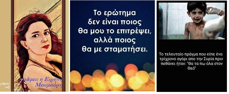 Για να έχεις κουβέντες με τον Θεό, χρειάζεσαι λόγο σοβαρό και ο θάνατος είναι. Εγώ και ο Θεός μου βρεθήκαμε απέναντι! Θυμωμένα του έλεγα μόνο δύο λέξεις «Γιατί» και «Άδικο». Ήρεμα μου απάντησε «Από αγάπη για να μην τους σκοτώσετε άγρια εσείς κάπου αργότερα μαζεύω πάλι πίσω τους αγγέλους μου, μαζί τους σας αντιπαλεύω . Έρχονται δίπλα σας μαθαίνουν τι έχετε ανάγκη και έρχονται πίσω για να συνεχίσουν να σας υπηρετούν, να σας υπηρετούμε».