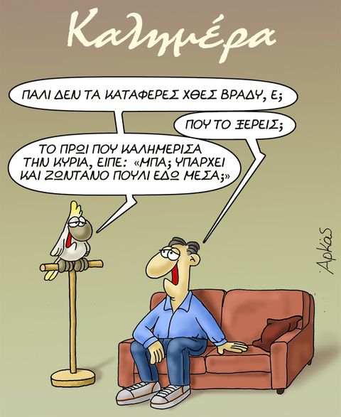Ο Αρκάς στο σημερινό σκίτσο μας δείχνει έναν παπαγάλο να μιλάει με έναν κύριο κατά τις πρώτες ώρες της ημέρας. Οι δύο τους σχολιάζουν τη χθεσινή βραδιά.