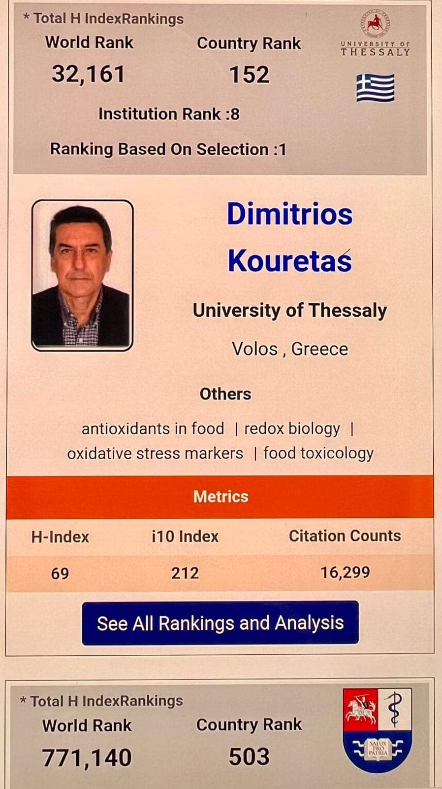Στο πεδίο oxidative stress markers Ranking based on selection Dimitrios Kouretas University of Thessaly Department of biochemistry biotechnology GreeceRanking 1