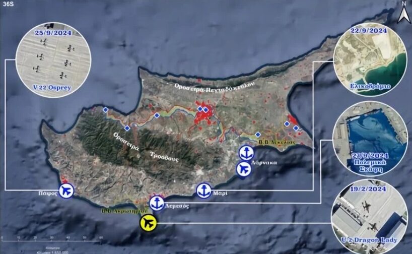 «Η Ελληνοκυπριακή Διοίκηση Κύπρου φιλοξενεί επί του παρόντος μεταφορικά αεροσκάφη C-130 του αεροδρομίου Λάρνακας, ελικόπτερα CH-47 Chinook και UH-1. Η αεροπορική βάση Ανδρέας Παπανδρέου, η οποία είναι επίσης ανοιχτή στη χρήση της Γερμανίας και άλλων συμμάχων χωρών, φιλοξενεί, μεταξύ άλλων, ελικόπτερα V-22 Osprey της αμερικανικής δύναμης αεροπλανοφόρου Wasp. Από την άλλη, στο λιμάνι της Λεμεσού, από τη δορυφορική φωτογραφία φαίνονται πολεμικά πλοία των ΗΠΑ και άλλων συμμάχων χωρών», αναφέρεται.