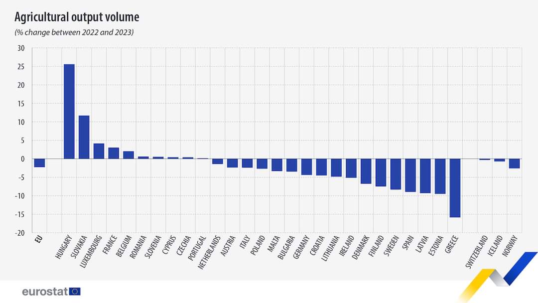Άλλη μια πρωτιά για τη χώρα μας. Επιτύχαμε τη μεγαλύτερη μείωση, 16%, στην αξία της αγροτικής παραγωγής το 2023 σε σχέση με το 2022, μεταξύ 30 χωρών.Το ξαναγράφω για να το εμπεδώσω, μειώθηκε η αγροτική παραγωγή στη χώρα μας κατά ένα έκτο (1/6) περίπου μέσα σε ένα χρόνο μόλις. Και νομίζω ότι και το 2024 θα υπάρξει επίσης μείωση. Ακούει κανείς;