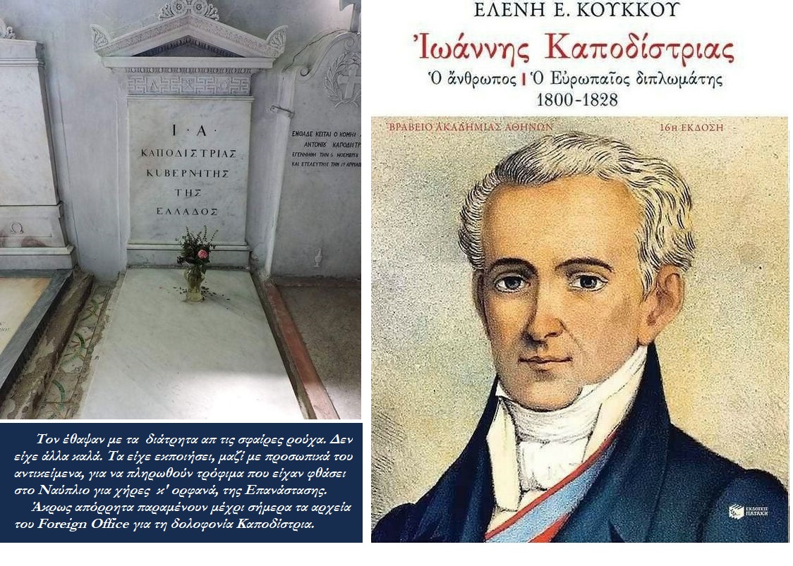 Τον έθαψαν στην Κέρκυρα, με τα ίδια ρούχα που φορούσε όταν δολοφονήθηκε.Δεν είχε άλλα καλά ρούχα.Τα είχε εκποιήσει κι αυτά μαζί με κάποια τελευταία του προσωπικά αντικείμενα για να πληρωθούν φορτία τροφίμων που είχαν φθάσει στο Ναύπλιο κι ήταν να μοιραστούν σε χήρες και ορφανά της Επανάστασης.