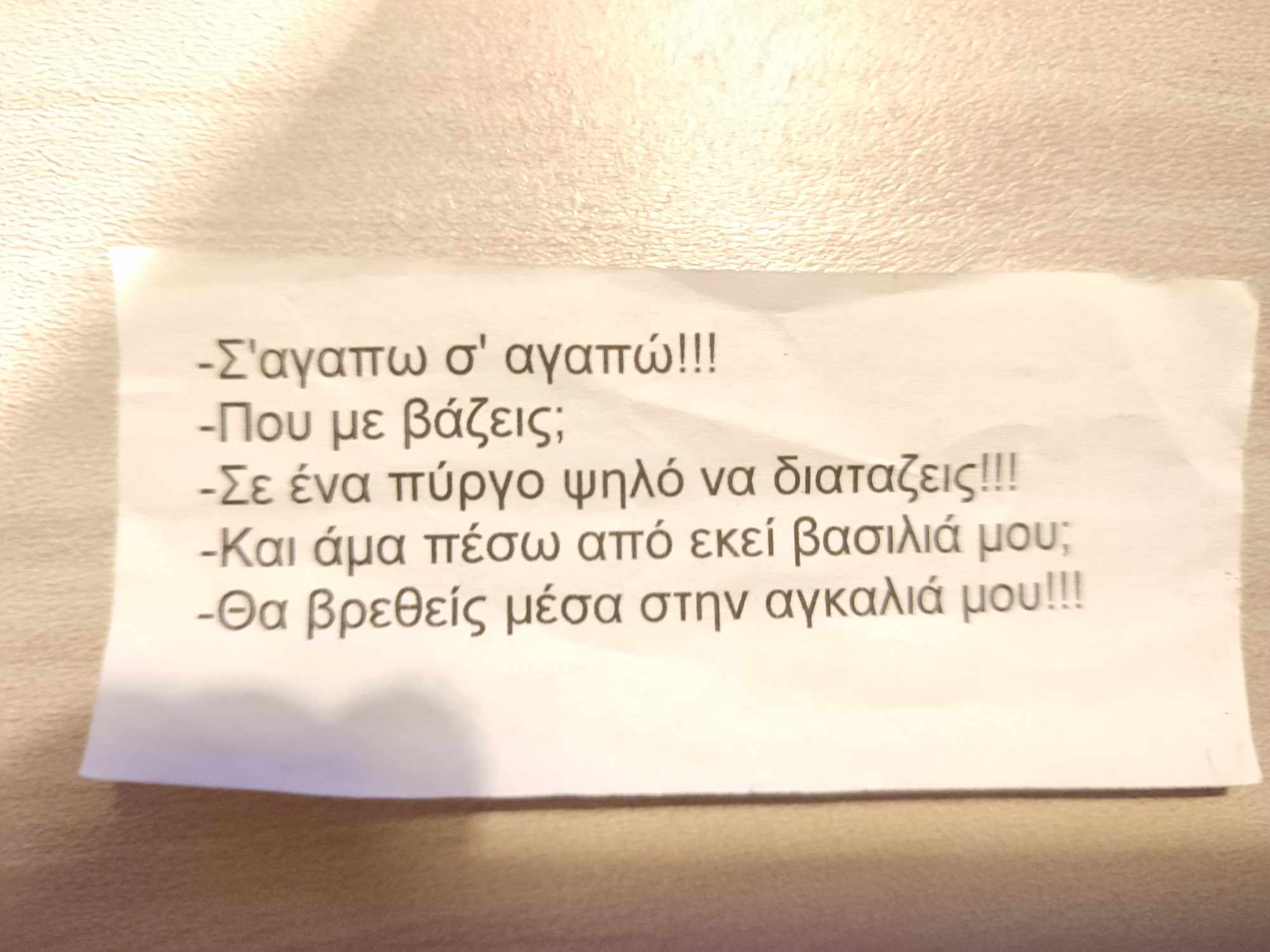 - Αυτό το χαρτάκι βρήκα και ”έσωσα” απ΄τον κάδο σκουπιδιών πέρυσι. Πιθανολογώ, πως προέρχεται από τη μαθητιώσα νεολαία, τα εγγόνια ή από κάποιες προηγούμενες ρομαντικές εποχές. Σήμερα όσο απομακρυνόμαστε από τα παιδικά μας χρόνια, απ΄τις ρίζες μας, τις δικές μας εποχές, τόσο σκληρότερα και ψυχρότερα βλέπουμε τα πράγματα.