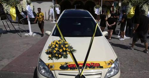 Η νεκροφόρα που μετέφερε τη σορό του 29χρονου έφερε κιτρινόμαυρες κορδέλες, ενώ το λευκό φέρετρο ήταν στολισμένο με κίτρινα τριαντάφυλλα και ένα κασκόλ της ΑΕΚ που έγραφε Original.