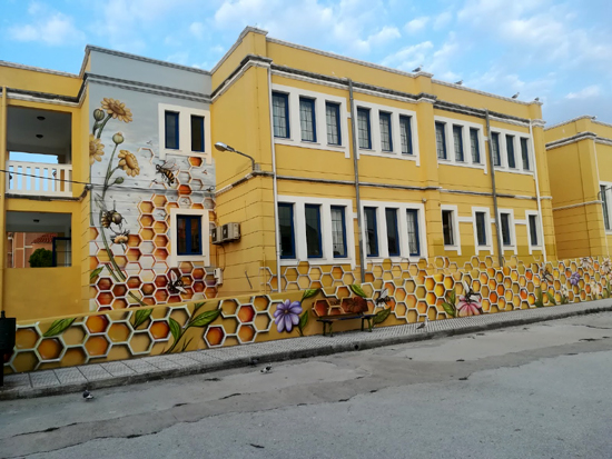 - Η μεταμόρφωση του σχολείου, ξεκίνησε με το βάψιμο του από ομάδες graffiti. Το θέμα που επιλέχθηκε ήταν τα μελίσσια, δηλαδή ένας κόσμος συνεργασίας και εργατικότητας. Αναμφίβολα όμως το εντυπωσιακότερο στοιχείο του χώρου, για το οποίο το σχολείο έγινε viral στα social media είναι η εξωτερική πόρτα του προαύλιου χώρου.