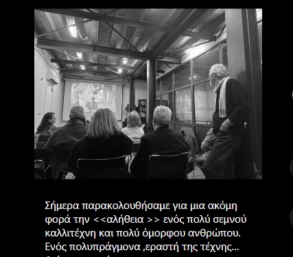 Η προβολή με προτζέκτορα κράτησε μιά ώρα περίπου και για άλλη μία φορά μας αποζημίωσε, αρκούντως. Το περιεχόμενο, τμήματος της μεγάλης συλλογής του ήταν: Φωτογραφίες δρόμου – τοπία και πορτρέτα.
