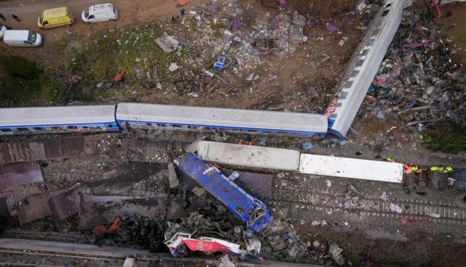 Εικόνες από drone από το πολύνεκρο σιδηροδρομικό δυστύχημα στα Τέμπη έξω από την Λάρισα © Eurokinissi / ΒΑΣΙΛΗΣ ΒΕΡΒΕΡΙΔΗΣ