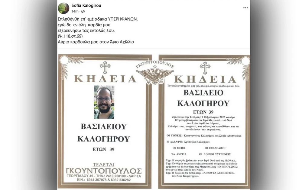 Η μητέρα του Βασίλη Καλογήρου με νέα της ανάρτηση στο Facebook αναγγέλλει τη κηδεία του γιου της που θα γίνει αύριο, Τετάρτη (19/2), στις 12 το μεσημέρι από τον Ιερό Μητροπολιτικό Ναό του Αγίου Αχιλλίου.