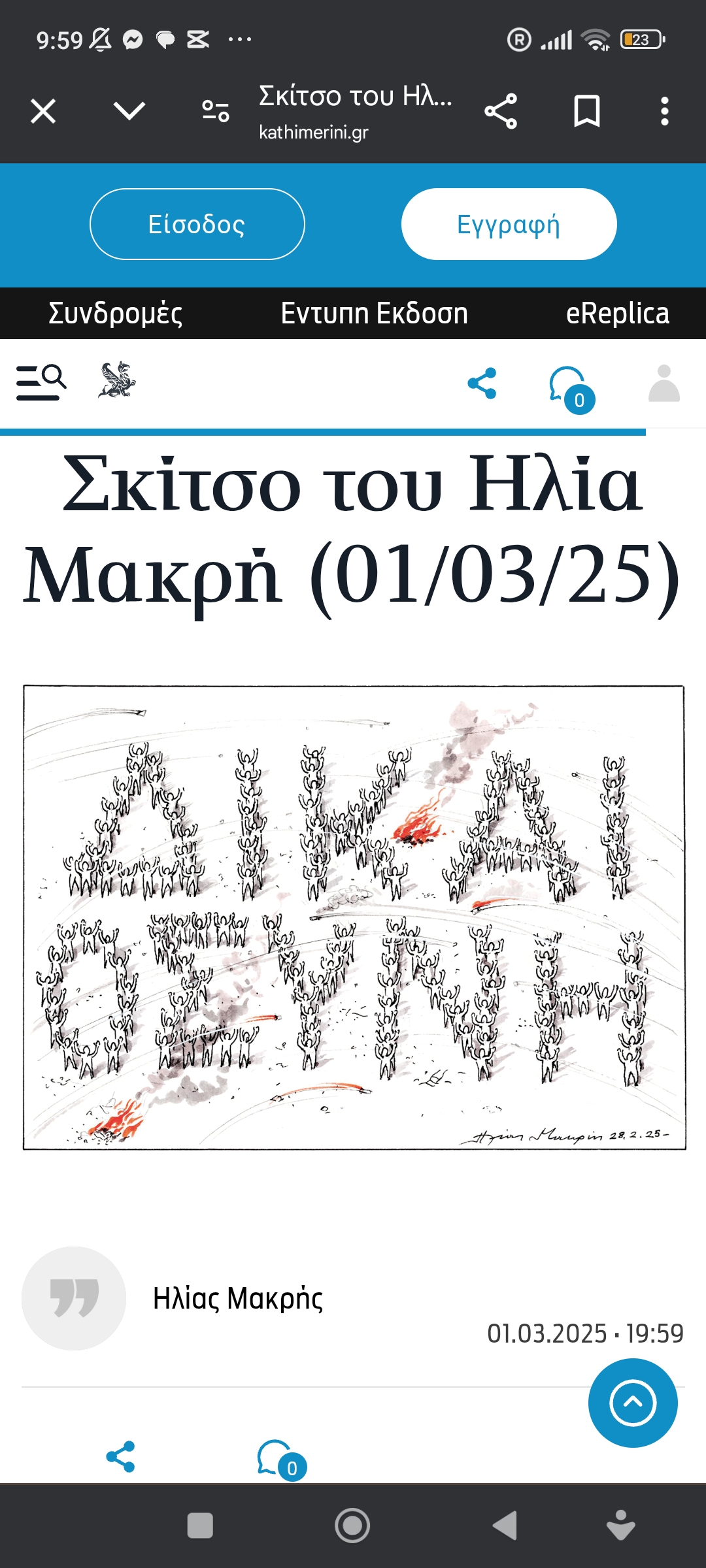 ...ξανά στα θρανία, στη μεγάλη των γελοιογράφων σχολήΔικαιοσύνη Πέτρος Ιωάννου1 έτος ago1 έτος ago01 mins Στη χώρα που γέννησε τη Δημοκρατία, δεν είναι αυτονόητη; 1/3/2025 Σκίτσο του Ηλία Μακρή για την Καθημερινή Πλοήγηση άρθρων Previous: Το κράτος δεν μπορεί να διαχειριστεί ανθρώπινες συγκεντρώσεις ή δεν θέλει;Next: Είδα όλη την συνέντευξη. Εξωφρενική η στάση Τράμπ και Βάνς Αφήστε μια απάντηση Ακύρωση απάντησηςΗ ηλ. διεύθυνση σας δεν δημοσιεύεται. Τα υποχρεωτικά πεδία σημειώνονται με *Σχόλιο * Όνομα * Email * Ιστότοπος Αποθήκευσε το όνομά μου, email, και τον ιστότοπο μου σε αυτόν τον πλοηγό για την επόμενη φορά που θα σχολιάσω.