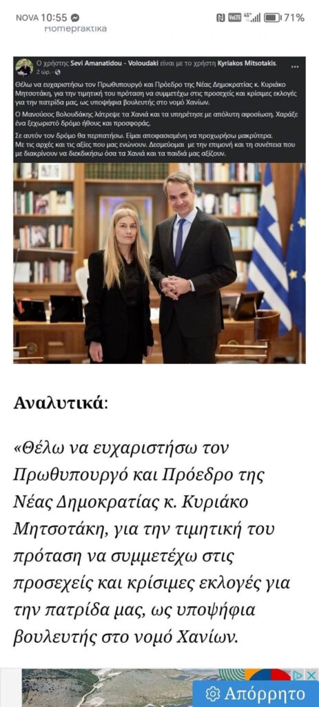 Στις 9 Φλεβάρη του 2023 έφυγε από τη ζωή ο φίλος,ο συνεργάτης και ο συμπατριώτης του πρωθυπουργού ,Μανούσος Βολουδάκης βουλευτής Χανίων. Αφού πέρασε το 40ημερο ,στις 23 του Μάρτη το 2023 η σύζυγος του αποβιώσαντος βουλευτή ανακοινώνει ότι δέχεται τη πρόταση του πρωθυπουργού και θα κατέβει στον πολιτικό στίβο για να τιμήσει το όνομα του συντρόφου της.
