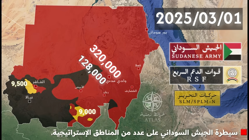 - Μεγάλης κλίμακας καταστροφή των υποδομών και σχεδόν ολοκληρωτική λεηλασία των περιουσιών, με αυτόν τον τρόπο απελευθερώθηκαν οι περιοχές που ο σουδανικός στρατός κατάφερε να απελευθερώσει από τις Δυνάμεις Ταχείας Υποστήριξης (RSF) στην πρωτεύουσα του Σουδάν, Χαρτούμ, μετά από σχεδόν δύο χρόνια ελέγχου των περιοχών αυτών από την πολιτοφυλακή.