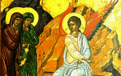 Και να, καθώς πλησίαζαν διαπίστωσαν πως η ασήκωτη βραχώδης “θύρα” είχε μετακινηθεί και η λαλιά του Αγγέλου, τις διαβεβαίωνε : “Ουκ έστιν ώδε”. Ο Κύριος που γυρεύετε να τιμήσετε δεν είναι εδώ, παρά μόνον τα νεκρικά σουδάρια (οι “επίδεσμοι” που τον είχαν τυλίξει). Το θαύμα είχε συντελεστεί.