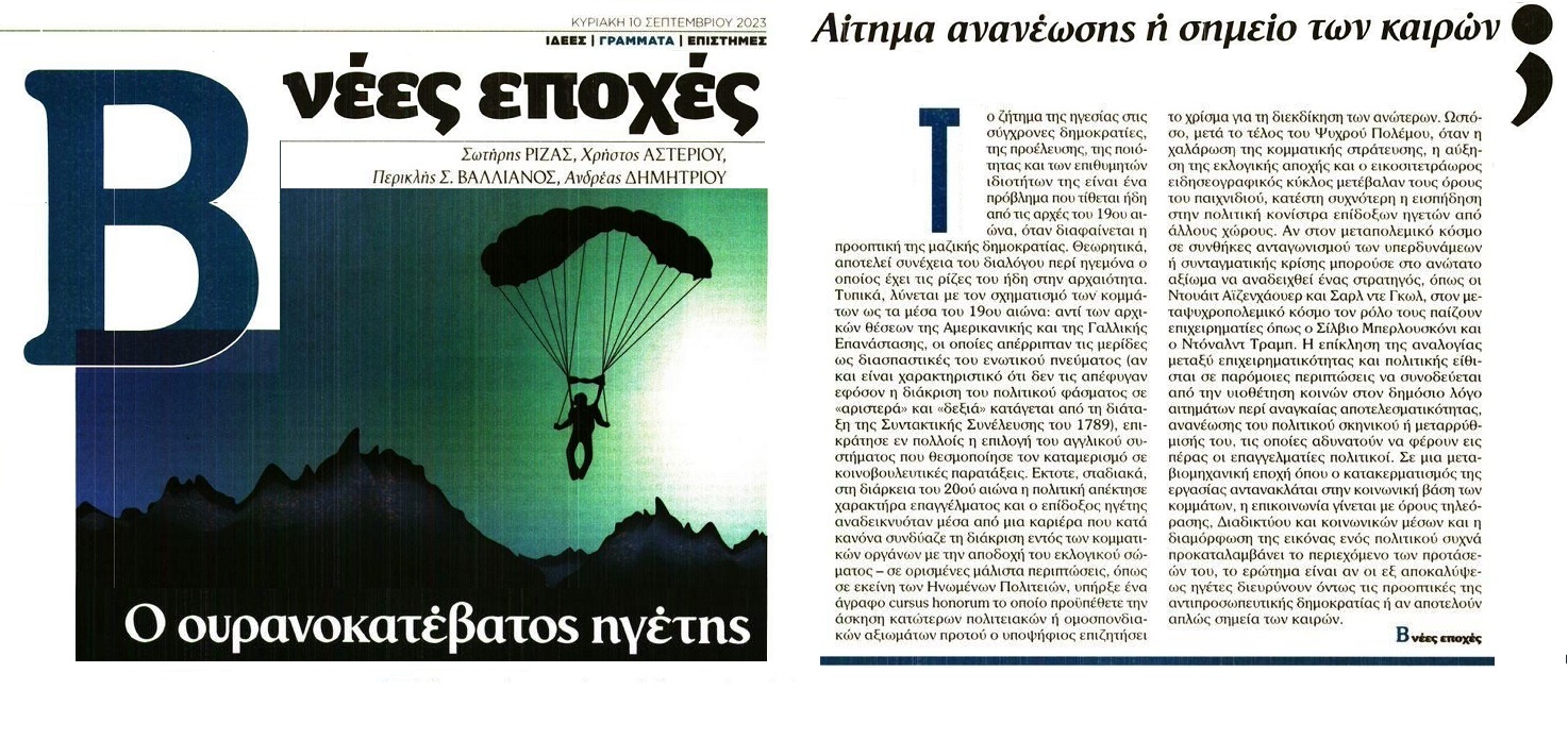Η επίκληση της αναλογίας μεταξύ επιχειρηματικότητας και πολιτικής είθισται σε παρόμοιες περιπτώσεις να συνοδεύεται από την υιοθέτηση κοινών στον δημόσιο λόγο αιτημάτων περί αναγκαίας αποτελεσματικότητας, ανανέωσης του πολιτικού σκηνικού ή μεταρρύθμισής του, τις οποίες αδυνατούν να φέρουν εις πέρας οι επαγγελματίες πολιτικοί. Σε μια μεταβιομηχανική εποχή όπου ο κατακερματισμός της εργασίας αντανακλάται στην κοινωνική βάση των κομμάτων, η επικοινωνία γίνεται με όρους τηλεόρασης, Διαδικτύου και κοινωνικών μέσων και η διαμόρφωση της εικόνας ενός πολιτικού συχνά προκαταλαμβάνει το περιεχόμενο των προτάσεών του, το ερώτημα είναι αν οι εξ αποκαλύψεως ηγέτες διευρύνουν όντως τις προοπτικές της αντιπροσωπευτικής δημοκρατίας ή αν αποτελούν απλώς σημεία των καιρών.