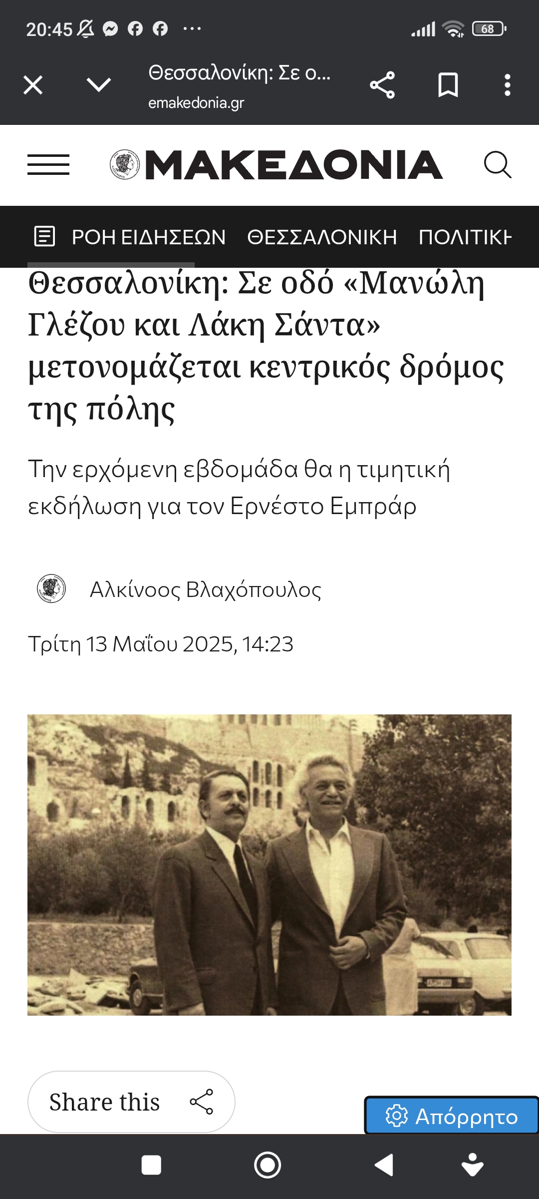 ...ξανά στα θρανία, στη μεγάλη των γελοιογράφων σχολήΣε οδό Μανώλη Γλέζου και Λάκη Σάντα μετονομάζεται δρόμος της πόλης Πέτρος Ιωάννου11 μήνες ago11 μήνες ago01 mins 14/5/2025 https://www.emakedonia.gr/thessaloniki-se-odo-manoli-glezoy-kai-laki-santa-metonomazetai-kentrikos-dromos-tis-polis Πλοήγηση άρθρων Previous: “Ιωάννης Καποδίστριας, δόξα και μοναξιά”Next: Την Κυριακή γιορτάζουν τα Μουσεία, με ελεύθερη είσοδο Αφήστε μια απάντηση Ακύρωση απάντησηςΗ ηλ. διεύθυνση σας δεν δημοσιεύεται. Τα υποχρεωτικά πεδία σημειώνονται με *Σχόλιο * Όνομα * Email * Ιστότοπος Αποθήκευσε το όνομά μου, email, και τον ιστότοπο μου σε αυτόν τον πλοηγό για την επόμενη φορά που θα σχολιάσω.