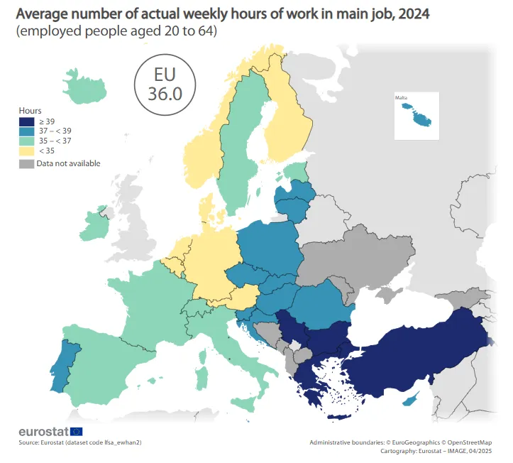 Οι πιο σκληρά εργαζόμενοι στην Ε.Ε. οι Έλληνες για το 2024 • Οι Έλληνες εργάζονται τρεις περισσότερες ώρες εβδομαδιαίως σε σύγκριση με τον μέσο όρο της Ε.Ε.Την πρώτη θέση κατακτά η χώρα μας, σύμφωνα με τα στοιχεία της Eurostat για το 2024, αναφορικά με τον εβδομαδιαίο χρόνο εργασίας μεταξύ των κρατών μελών της Ευρωπαϊκής Ένωσης.