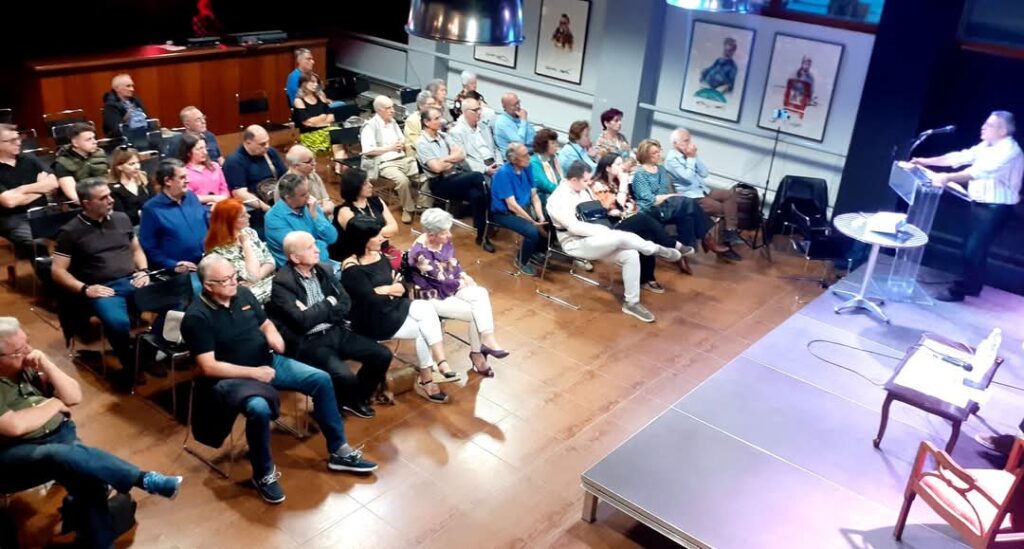 Ο ομιλητής, Κώστας Τάταρης, αναγνώστης και μελετητής όλου του έργου του μεγάλου δημιουργού, καθήλωσε το κοινό με την ημίωρη ομιλία του κι ανέλυσε με εύρος και βάθος την άποψή του για τον συνεχή ανήφορο και τον συμβολισμό του, την αέναη κίνηση κι άνοδο στο όρος, τις αντιφάσεις («φτάσε όπου δε μπορείς»), το μεγάλο Ναι και το μεγάλο Όχι, την ωριμότητα μέχρι τη σιγή, κ.α. Ακολούθησε ενδιαφέρουσα συζήτηση κι αλληλεπίδραση με το κοινό, τέθηκαν ερωτήματα κι ανταλλάχθηκαν απόψεις.