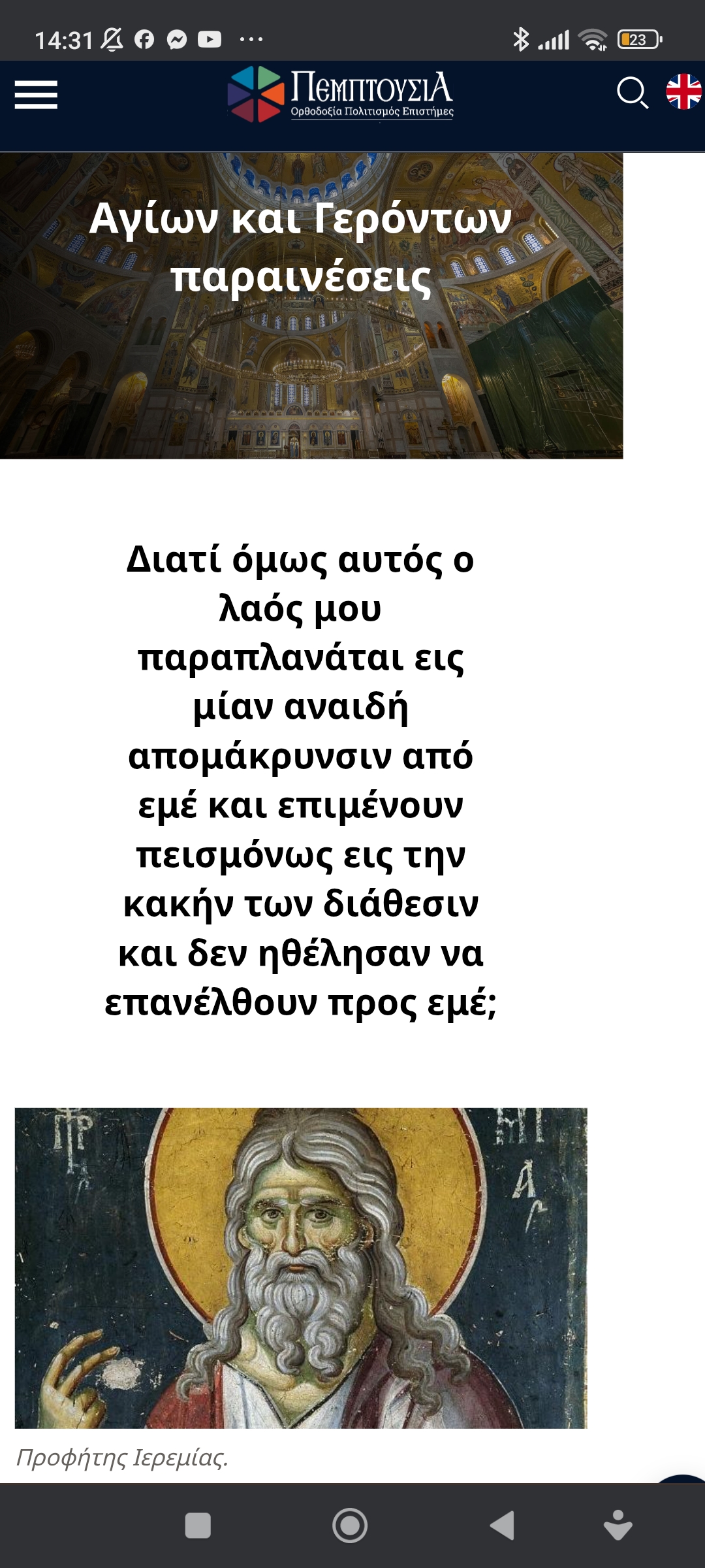 "Πίστη το ένα το σκαλί..."Γιατί όμως αυτός ο λαός μου παραπλανάται κι απομακρύνεται αναιδώς από μένα; Πέτρος Ιωάννου11 μήνες ago11 μήνες ago01 mins 30/5/2025 https://www.pemptousia.gr/2025/05/diati-omos-aftos-o-laos-mou-paraplanatai-eis-mian-anaidi-apomakrynsin-apo-eme-kai-epimenoun-peismonos-eis-tin-kakin-ton-diathesin-kai-den-ithelisan-na-epanelthoun-pros-eme Πλοήγηση άρθρων Previous: Εγώ είμαι ο γκρεμιστής, γιατί είμ’ εγώ κι ο κτίστηςNext: Αρχαίο θέατρο, περιβάλλουσα περιοχή, αξιόλογα κτίρια Λάρισας Αφήστε μια απάντηση Ακύρωση απάντησηςΗ ηλ. διεύθυνση σας δεν δημοσιεύεται. Τα υποχρεωτικά πεδία σημειώνονται με *Σχόλιο * Όνομα * Email * Ιστότοπος Αποθήκευσε το όνομά μου, email, και τον ιστότοπο μου σε αυτόν τον πλοηγό για την επόμενη φορά που θα σχολιάσω.