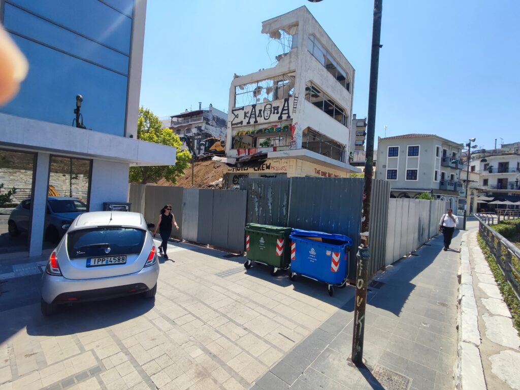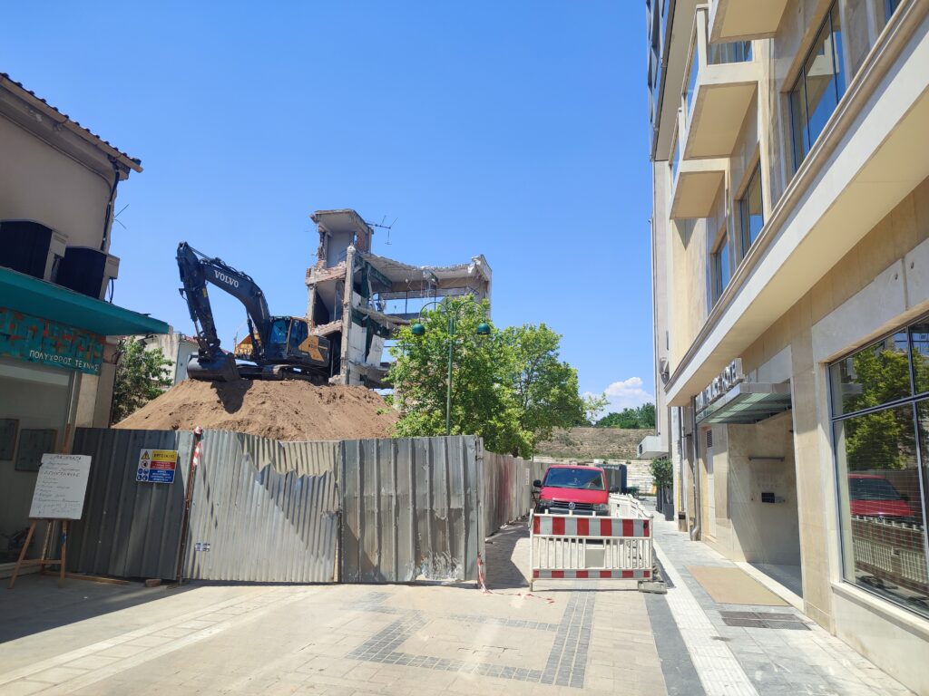 Καμίνι και η Λάρισα, ντάλα μεσημέρι. Στο καταμεσήμερο οι εργαζόμενοι (στην κατεδάφιση) σε μια σκιά μελαγχολούν, μετά την καρφωτή απ’ τον τρίτο όροφο του παρακείμενου ξενοδοχείου (divani) αναλογιζόμενοι πώς θα συνεχισθεί απρόσκοπτα η κατεδάφιση.