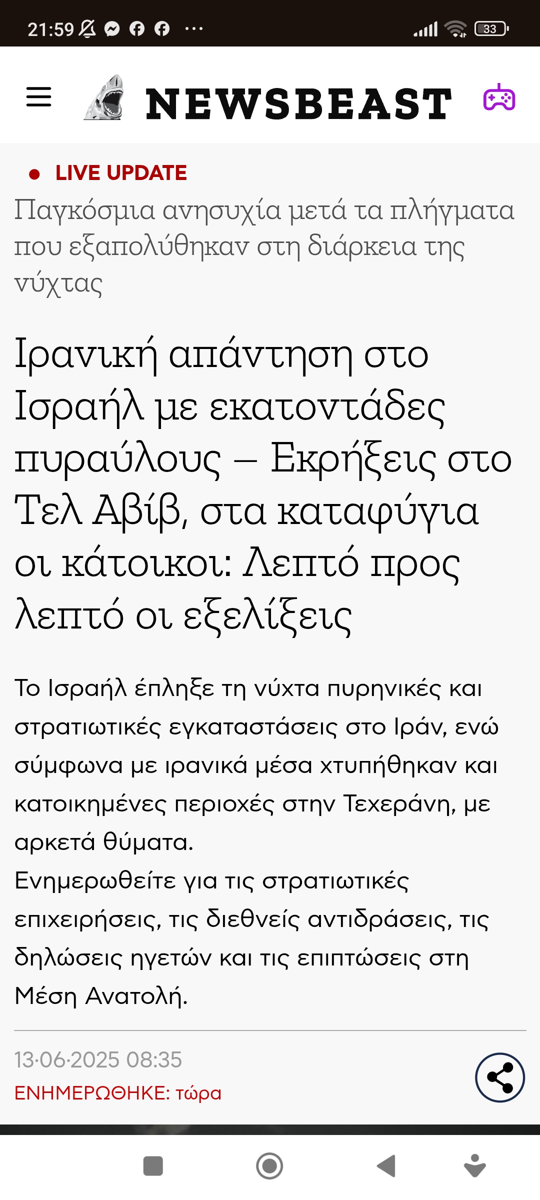 Eυρώπη / ΔιεθνήΗ πυραυλική αντίδραση του Ιράν εναντίον του Ισραήλ Πέτρος Ιωάννου10 μήνες ago10 μήνες ago01 mins 13/6/2025 https://www.newsbeast.gr/world/arthro/12387256/to-israil-epitethike-sto-iran-lepto-pros-lepto-oi-exelixeis Πλοήγηση άρθρων Previous: Ρεκόρ πωλήσεων απ’ την οικογένεια ΣαράντηNext: Σκίτσο του Γιώργου Καπράνου για το arcadiaportal Αφήστε μια απάντηση Ακύρωση απάντησηςΗ ηλ. διεύθυνση σας δεν δημοσιεύεται. Τα υποχρεωτικά πεδία σημειώνονται με *Σχόλιο * Όνομα * Email * Ιστότοπος Αποθήκευσε το όνομά μου, email, και τον ιστότοπο μου σε αυτόν τον πλοηγό για την επόμενη φορά που θα σχολιάσω.