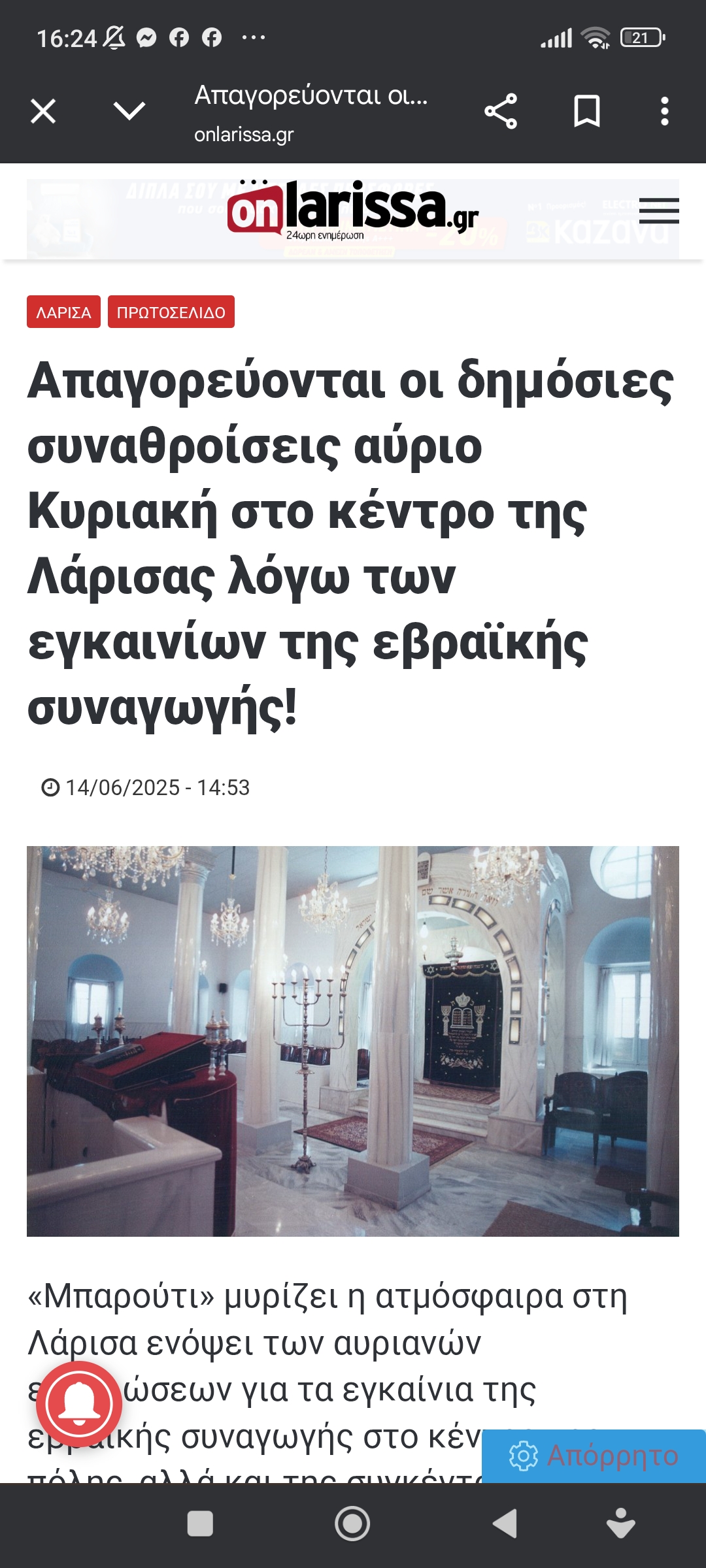Θεσσαλία / ΛάρισαΑπαγορεύονται σήμερα στο κέντρο της Λάρισας οι συναθροίσεις, λόγω συναγωγής Πέτρος Ιωάννου10 μήνες ago10 μήνες ago01 mins 15/6/2025 https://www.onlarissa.gr/2025/06/14/apagorevontai-oi-dimosies-ypaithries-synathroiseis-avrio-kyriaki-sto-kentro-tis-larisas Πλοήγηση άρθρων Previous: Για νάμαστε δίκαιοι ας λάβουμε υπόψη ποιοί ήταν στην Περσία πριν τους μουλάδεςNext: Μετά από έξι χρόνια η συναγωγή Λάρισας επαναλειτουργεί Αφήστε μια απάντηση Ακύρωση απάντησηςΗ ηλ. διεύθυνση σας δεν δημοσιεύεται. Τα υποχρεωτικά πεδία σημειώνονται με *Σχόλιο * Όνομα * Email * Ιστότοπος Αποθήκευσε το όνομά μου, email, και τον ιστότοπο μου σε αυτόν τον πλοηγό για την επόμενη φορά που θα σχολιάσω.