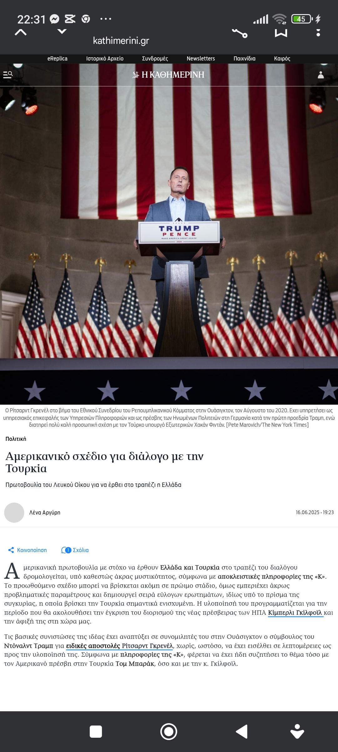 Ελλάδα / ΚύπροςΔιάλογο ελληνοτουρκικό ετοιμάζουν οι ΗΠΑ Πέτρος Ιωάννου10 μήνες ago10 μήνες ago01 mins 26/6/2025 https://www.kathimerini.gr/politics/563662330/amerikaniko-schedio-gia-dialogo-me-tin-toyrkia-k Πλοήγηση άρθρων Previous: Σκίτσο του Ανδρέα Πετρουλάκη για την ΚαθημερινήNext: Οn camera, το χτύπημα και η διακοπή ζωντανής μετάδοσης Αφήστε μια απάντηση Ακύρωση απάντησηςΗ ηλ. διεύθυνση σας δεν δημοσιεύεται. Τα υποχρεωτικά πεδία σημειώνονται με *Σχόλιο * Όνομα * Email * Ιστότοπος Αποθήκευσε το όνομά μου, email, και τον ιστότοπο μου σε αυτόν τον πλοηγό για την επόμενη φορά που θα σχολιάσω.