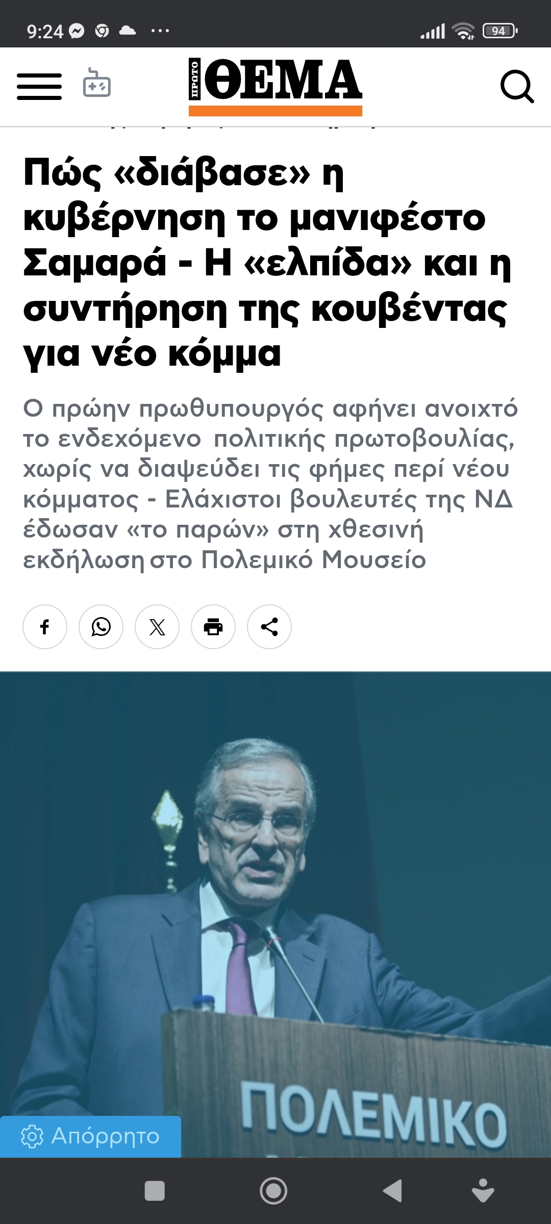 Κοινωνία / ΠολιτικήΚυβέρνηση και μανιφέστο Σαμαρά Πέτρος Ιωάννου10 μήνες ago10 μήνες ago01 mins 18/6/2025 https://www.protothema.gr/politics/article/1656243/pos-diavase-i-kuvernisi-to-manifesto-samara-i-elpida-kai-i-sudirisi-tis-kouvedas-gia-neo-komma Πλοήγηση άρθρων Previous: Καρυστιανού: Η επιστολή Μητσοτάκη προς Ντογιάκο σήμαινε, να πάμε απ’ τον τυχαίο ανακριτή, στον κ. ΜπακαΐμηNext: Σκίτσο του Ηλία Μακρή για την Καθημερινή Αφήστε μια απάντηση Ακύρωση απάντησηςΗ ηλ. διεύθυνση σας δεν δημοσιεύεται. Τα υποχρεωτικά πεδία σημειώνονται με *Σχόλιο * Όνομα * Email * Ιστότοπος Αποθήκευσε το όνομά μου, email, και τον ιστότοπο μου σε αυτόν τον πλοηγό για την επόμενη φορά που θα σχολιάσω.