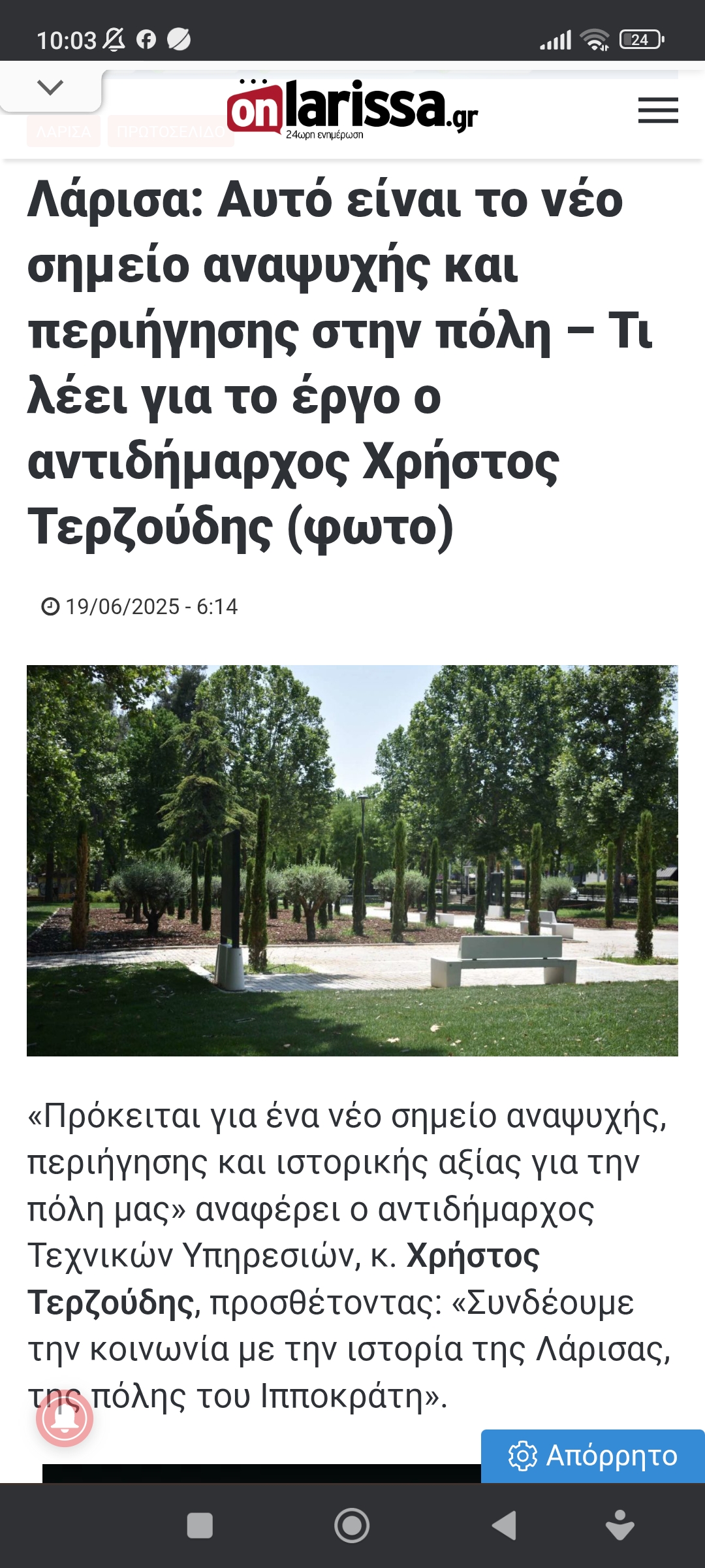 Θεσσαλία / ΛάρισαΦροντίδα κι αλλαγές σε ήδη υπάρχοντα χώρο Πέτρος Ιωάννου10 μήνες ago10 μήνες ago01 mins 19/6/2025 https://www.onlarissa.gr/2025/06/19/larisa-afto-einai-to-neo-simeio-anapsychis-kai-periigisis-stin-poli-ti-leei-gia-to-ergo-o-chr-terzoudis-foto Πλοήγηση άρθρων Previous: Αφού καμαρώνουν γι’ απόδοση δικαιοσύνης, προς τί οι απειλές;Next: Μια καλημέρα από τον ΚΥΡ Αφήστε μια απάντηση Ακύρωση απάντησηςΗ ηλ. διεύθυνση σας δεν δημοσιεύεται. Τα υποχρεωτικά πεδία σημειώνονται με *Σχόλιο * Όνομα * Email * Ιστότοπος Αποθήκευσε το όνομά μου, email, και τον ιστότοπο μου σε αυτόν τον πλοηγό για την επόμενη φορά που θα σχολιάσω.