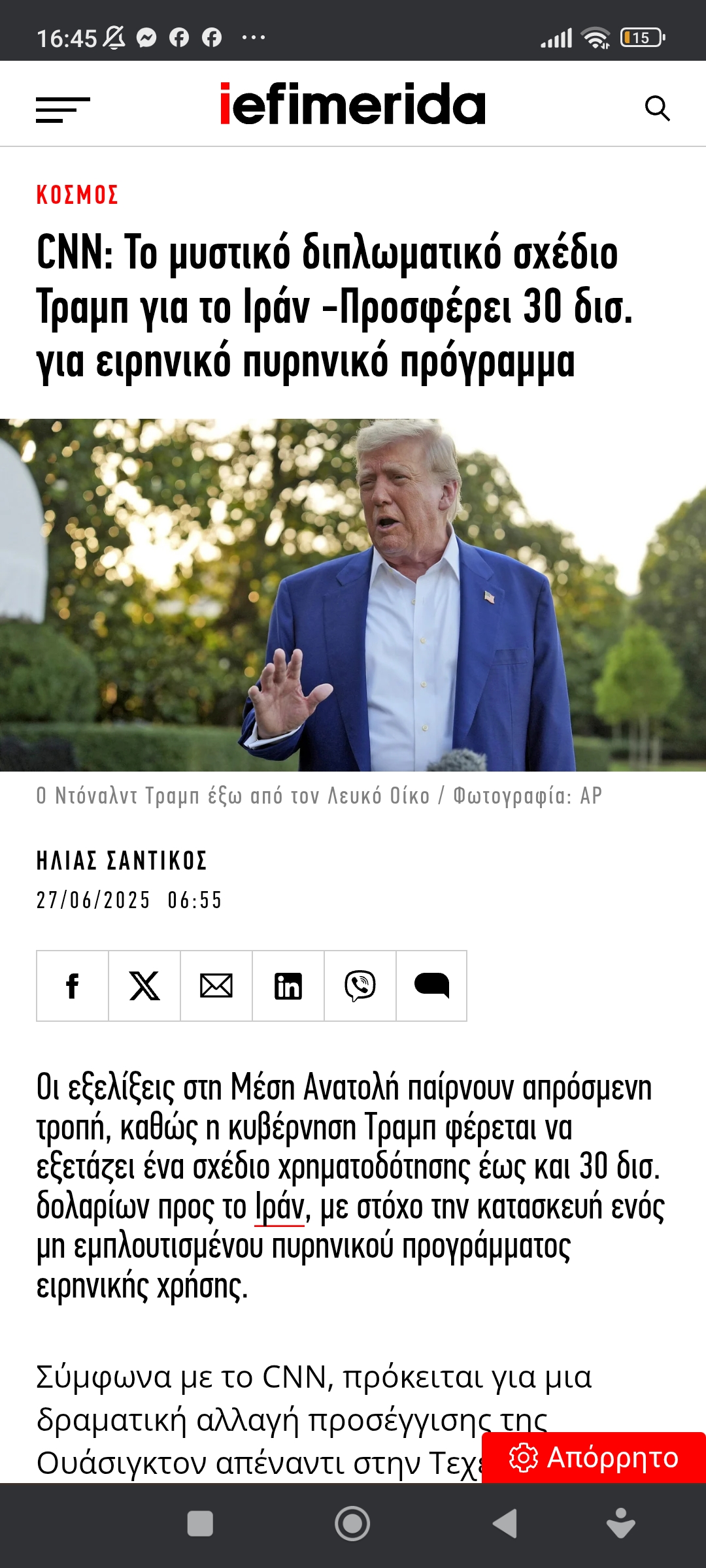 Eυρώπη / ΔιεθνήΣχέδιο Τράμπ για Ιρανικό ειρηνικό σταθμό πυρηνικής ενέργειας. Το κόστος στους Άραβες Πέτρος Ιωάννου10 μήνες ago10 μήνες ago01 mins 17/6/2025 https://www.iefimerida.gr/kosmos/mystiko-shedio-tramp-30-dis-teherani-eiriniko-pyriniko-programma Πλοήγηση άρθρων Previous: Σκίτσο του Αντώνη Βαβαγιάννη για το NEWS24Next: Οι τόποι λατρείας, φέρουν και το ιδιοκτησιακό. Ούτε λέξη… Αφήστε μια απάντηση Ακύρωση απάντησηςΗ ηλ. διεύθυνση σας δεν δημοσιεύεται. Τα υποχρεωτικά πεδία σημειώνονται με *Σχόλιο * Όνομα * Email * Ιστότοπος Αποθήκευσε το όνομά μου, email, και τον ιστότοπο μου σε αυτόν τον πλοηγό για την επόμενη φορά που θα σχολιάσω.
