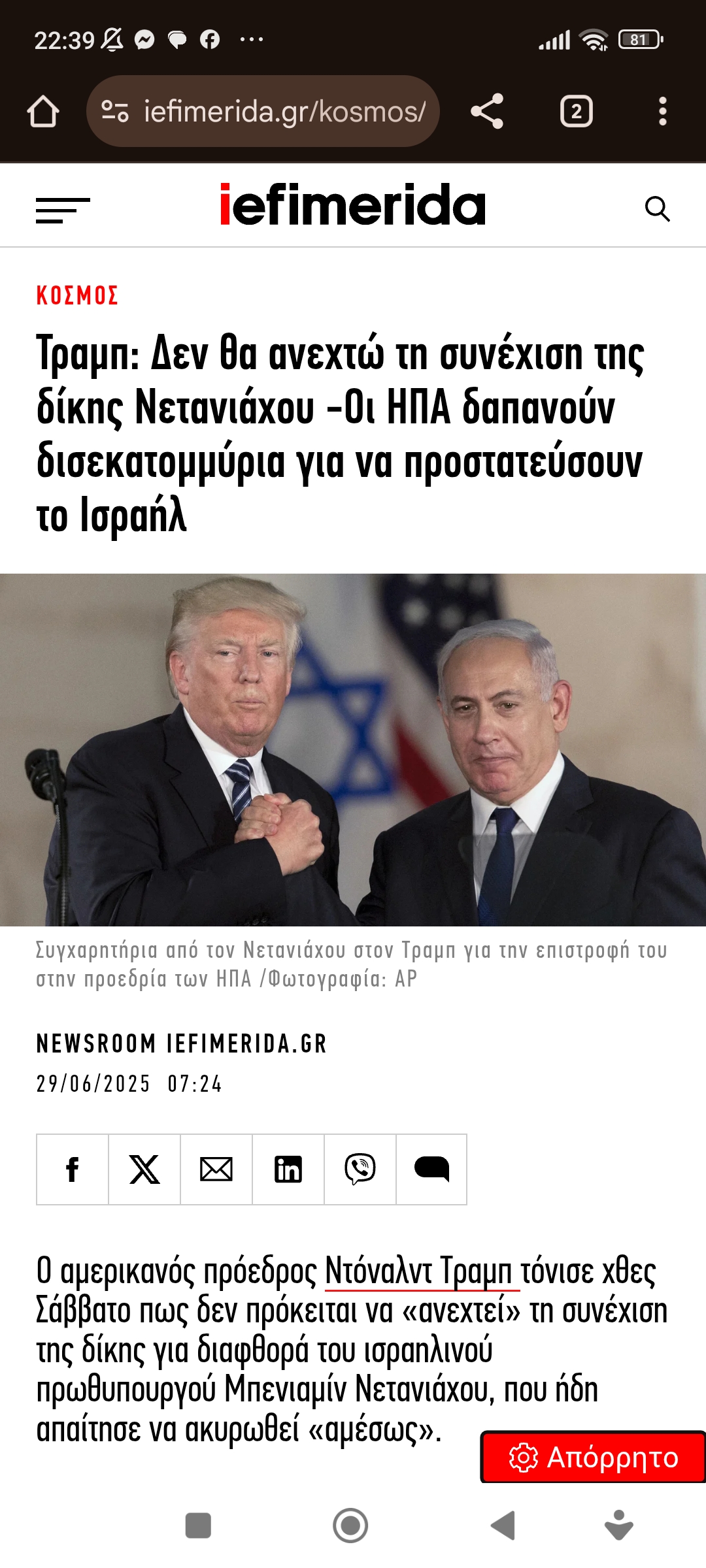 Eυρώπη / Διεθνή Έγκλημα και τιμωρίαΑσυλίες πλουσιοπάροχα δίνονται εν Ελλάδι. Η Ισραηλινή δικαιοσύνη αρνήθηκε, όμως ο Πλανητάρχης την απαίτησε… την πήρε Πέτρος Ιωάννου10 μήνες ago10 μήνες ago01 mins 29/6/2025 https://www.iefimerida.gr/kosmos/tramp-den-tha-anehto-ti-synehisi-tis-dikis-toy-prothypoyrgoy-toy-israil-netaniahoy Πλοήγηση άρθρων Previous: Σκίτσο του Στάθη για το,,militaire.grNext: Μια Παπανδρέου απ’ την Άρτα που τρέμουν υπουργοί κι όχι μόνον Αφήστε μια απάντηση Ακύρωση απάντησηςΗ ηλ. διεύθυνση σας δεν δημοσιεύεται. Τα υποχρεωτικά πεδία σημειώνονται με *Σχόλιο * Όνομα * Email * Ιστότοπος Αποθήκευσε το όνομά μου, email, και τον ιστότοπο μου σε αυτόν τον πλοηγό για την επόμενη φορά που θα σχολιάσω.