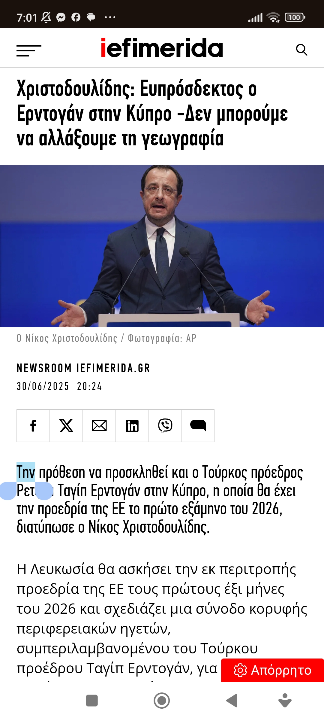 Eυρώπη / Διεθνή Ελλάδα / ΚύπροςΕυπρόσδεκτη στην Κύπρο η κατοχική Τουρκία, λόγω γεωγραφίας Πέτρος Ιωάννου10 μήνες ago10 μήνες ago01 mins 1/7/2025 https://www.iefimerida.gr/kosmos/hristodoylidis-eyprosdektos-o-erntogan-stin-kypro Πλοήγηση άρθρων Previous: Ζαχαριάδης: Με εντολή Στάλιν, ο 2ος εμφύλιος*. Σκέψεις και συμπεράσματα απ’ τον Άκη ΝικολόπουλοNext: Έφυγε νωρίς αλλά ο θάνατός του έγινε καταλύτης εξελίξεων Αφήστε μια απάντηση Ακύρωση απάντησηςΗ ηλ. διεύθυνση σας δεν δημοσιεύεται. Τα υποχρεωτικά πεδία σημειώνονται με *Σχόλιο * Όνομα * Email * Ιστότοπος Αποθήκευσε το όνομά μου, email, και τον ιστότοπο μου σε αυτόν τον πλοηγό για την επόμενη φορά που θα σχολιάσω.
