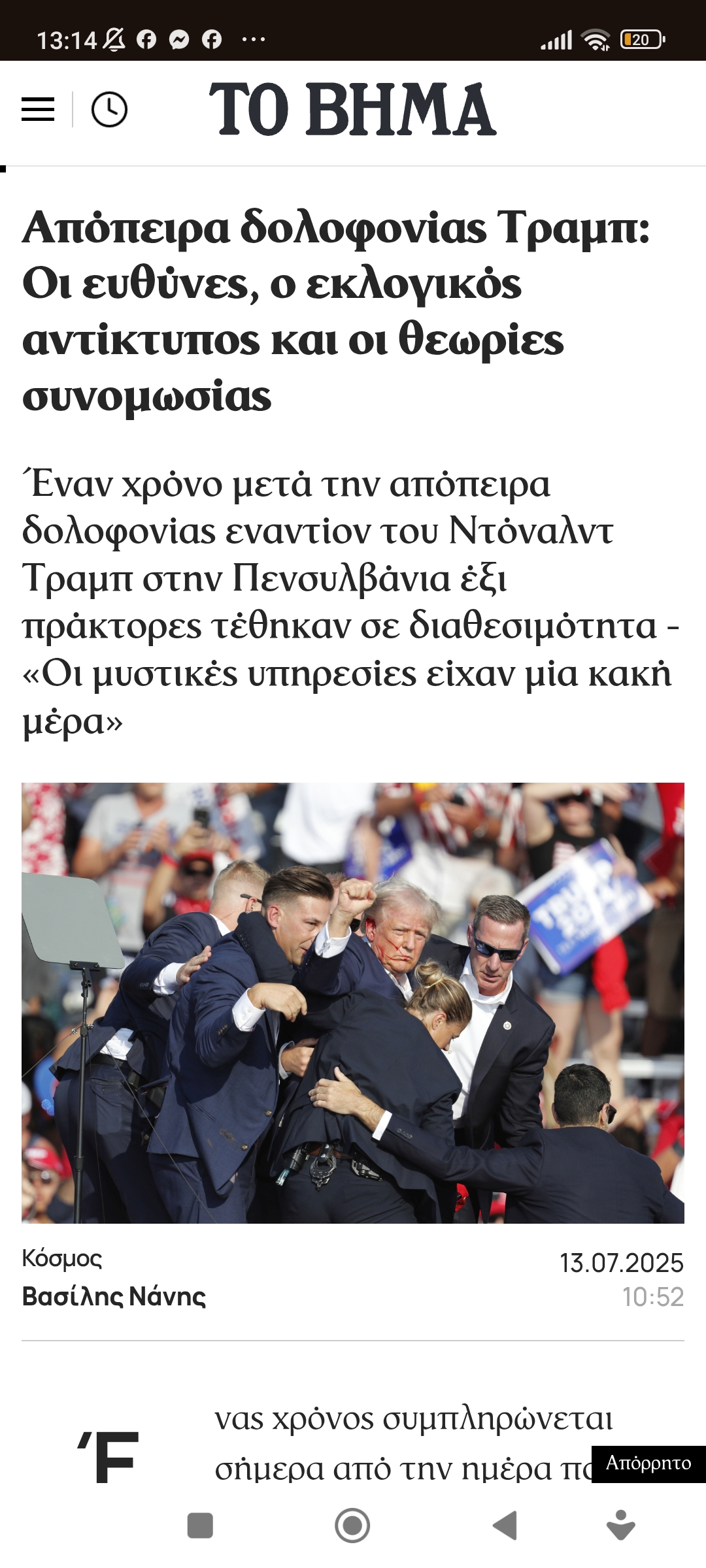 Eυρώπη / Διεθνή“Κακή μέρα” για τις μυστικές υπηρεσίες. Ένας χρόνος μετά… Πέτρος Ιωάννου9 μήνες ago9 μήνες ago01 mins 13/7/2025 Απόπειρα δολοφονίας Τραμπ: Οι ευθύνες, ο εκλογικός αντίκτυπος και οι θεωρίες συνομωσίας Πλοήγηση άρθρων Previous: Αντι-φάσειςNext: “Μαγειρέματα”. Οι πλύσεις του “πλυντηρίου” είναι τρείς Αφήστε μια απάντηση Ακύρωση απάντησηςΗ ηλ. διεύθυνση σας δεν δημοσιεύεται. Τα υποχρεωτικά πεδία σημειώνονται με *Σχόλιο * Όνομα * Email * Ιστότοπος Αποθήκευσε το όνομά μου, email, και τον ιστότοπο μου σε αυτόν τον πλοηγό για την επόμενη φορά που θα σχολιάσω.