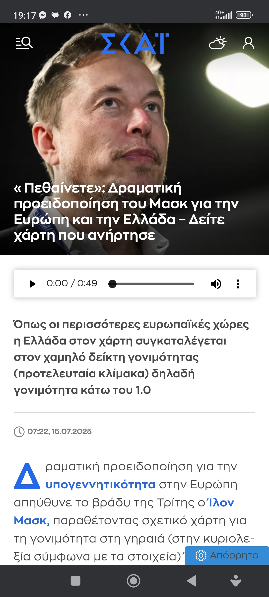 Eυρώπη / ΔιεθνήΈλον Μάσκ: Πεθαίνετε Πέτρος Ιωάννου9 μήνες ago9 μήνες ago01 mins 15/7/2025 https://www.skai.gr/news/world/mask-dramatiki-proeidopoiisi-gia-tin-eyropi-kai-tin-ellada Πλοήγηση άρθρων Previous: Η καλημέρα του ΑρκάNext: Εθνική αντίσταση αλλά και φαγωμάρα, το εθνικό μας σπορ. Με τον Άκη Νικολόπουλο Αφήστε μια απάντηση Ακύρωση απάντησηςΗ ηλ. διεύθυνση σας δεν δημοσιεύεται. Τα υποχρεωτικά πεδία σημειώνονται με *Σχόλιο * Όνομα * Email * Ιστότοπος Αποθήκευσε το όνομά μου, email, και τον ιστότοπο μου σε αυτόν τον πλοηγό για την επόμενη φορά που θα σχολιάσω.