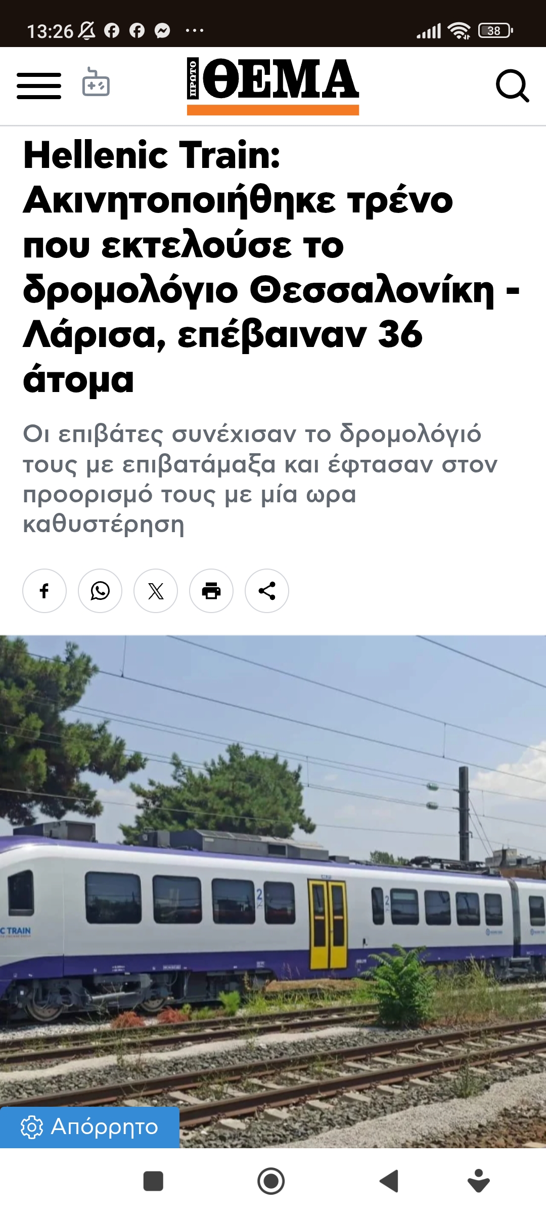 Οδική ασφάλεια - Μ.Μ.ΜεταφοράςΓελάμε με τα τρένα της ντροπής, μα είναι έργο των κυβερνήσεων του λαού… Πέτρος Ιωάννου9 μήνες ago9 μήνες ago01 mins 24/7/2025 https://www.protothema.gr/greece/article/1673524/hellenic-train-vlavi-se-amaxostoihia-pou-anahorise-apo-ti-thessaloniki-me-proorismo-ti-larisa Πλοήγηση άρθρων Previous: Πρωτοφανείς διαδηλώσεις στην ΟυκρανίαNext: Σαν σήμερα 24/7/1909 ιδρύθηκε η Φεντερασιόν στη Θεσσαλονίκη Αφήστε μια απάντηση Ακύρωση απάντησηςΗ ηλ. διεύθυνση σας δεν δημοσιεύεται. Τα υποχρεωτικά πεδία σημειώνονται με *Σχόλιο * Όνομα * Email * Ιστότοπος Αποθήκευσε το όνομά μου, email, και τον ιστότοπο μου σε αυτόν τον πλοηγό για την επόμενη φορά που θα σχολιάσω.
