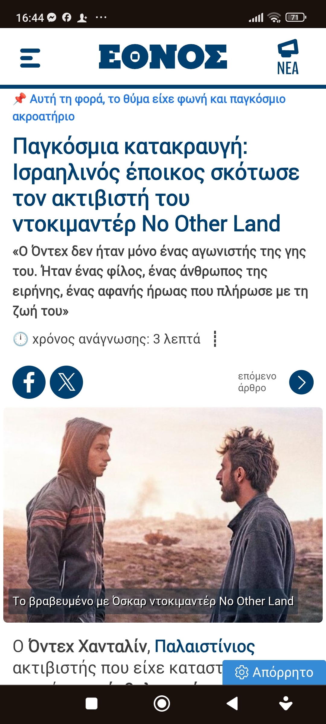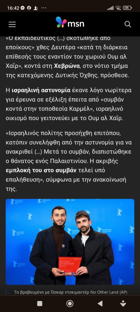Eυρώπη / Διεθνή Έγκλημα και τιμωρίαΠαγκόσμια κατακραυγή: Ισραηλινός έποικος σκότωσε βραβευμένο Παλαιστίνιο ακτιβιστή Πέτρος Ιωάννου9 μήνες ago9 μήνες ago01 mins 29/7/2025 https://www.msn.com/el-gr/news/other/%CF%80%CE%B1%CE%B3%CE%BA%CF%8C%CF%83%CE%BC%CE%B9%CE%B1-%CE%BA%CE%B1%CF%84%CE%B1%CE%BA%CF%81%CE%B1%CF%85%CE%B3%CE%AE-%CE%B9%CF%83%CF%81%CE%B1%CE%B7%CE%BB%CE%B9%CE%BD%CF%8C%CF%82-%CE%AD%CF%80%CE%BF%CE%B9%CE%BA%CE%BF%CF%82-%CF%83%CE%BA%CF%8C%CF%84%CF%89%CF%83%CE%B5-%CF%84%CE%BF%CE%BD-%CE%B1%CE%BA%CF%84%CE%B9%CE%B2%CE%B9%CF%83%CF%84%CE%AE-%CF%84%CE%BF%CF%85-%CE%BD%CF%84%CE%BF%CE%BA%CE%B9%CE%BC%CE%B1%CE%BD%CF%84%CE%AD%CF%81-no-other-land/ar-AA1JubD3?ocid=mobilepwa&cvid=a5d8c6a35fdd4b0e9146442ce055b9a2&ei=10 Πλοήγηση άρθρων Previous: Ενεργειακή υποτέλεια με το αζημίωτο: Γιατί το deal Ε.Ε.–Τραμπ για αγορά αμερικανικής ενέργειας θεωρείται ανεδαφικόNext: Ισραηλινοί, “ξεφαντώνουν”… στη Ρόδο Αφήστε μια απάντηση Ακύρωση απάντησηςΗ ηλ. διεύθυνση σας δεν δημοσιεύεται. Τα υποχρεωτικά πεδία σημειώνονται με *Σχόλιο * Όνομα * Email * Ιστότοπος Αποθήκευσε το όνομά μου, email, και τον ιστότοπο μου σε αυτόν τον πλοηγό για την επόμενη φορά που θα σχολιάσω.