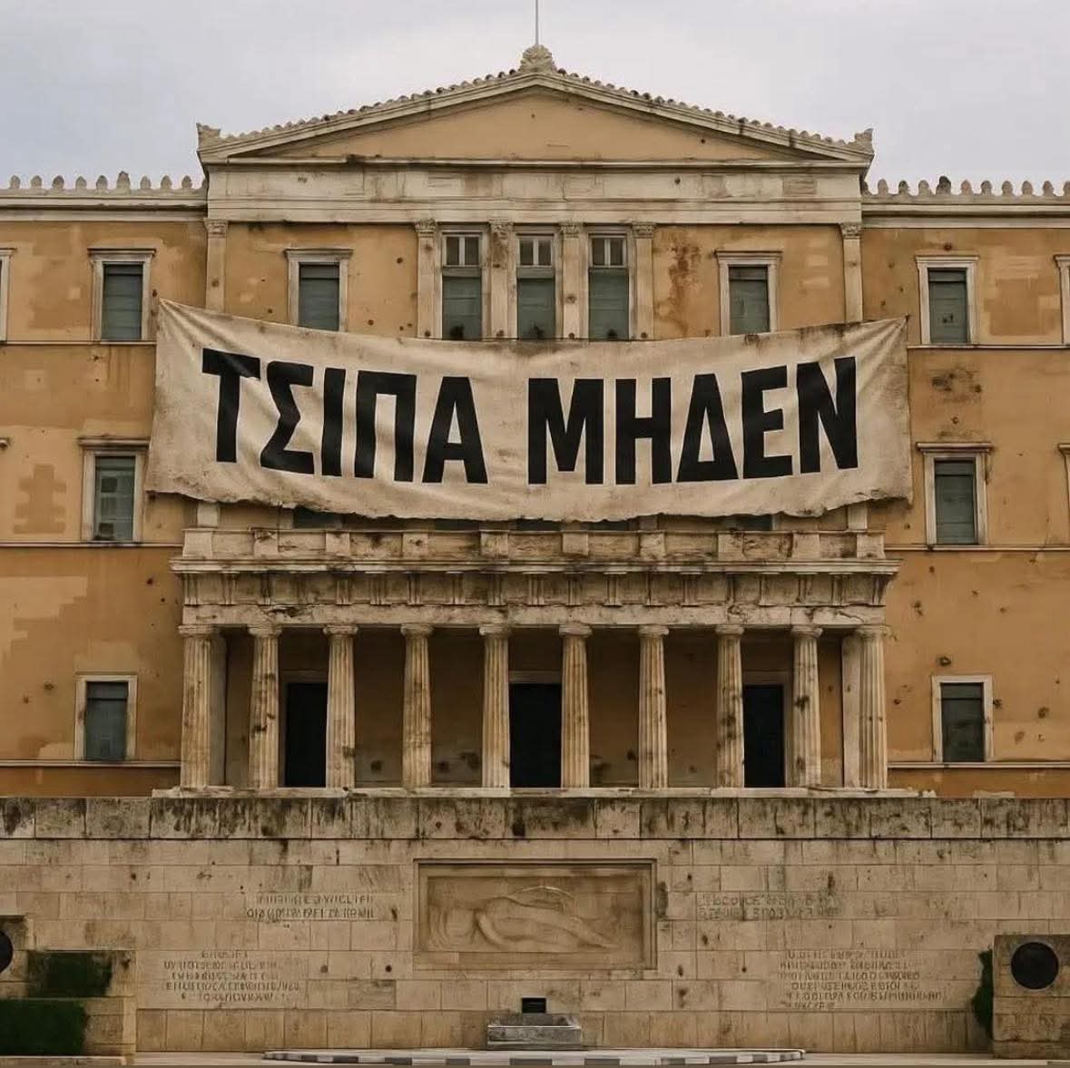 Το πανό «ΤΣΙΠΑ ΜΗΔΕΝ» δεν είναι απλώς ένα συνθηματικό ξέσπασμα, είναι μια εικονογραφική αποτύπωση της απώλειας θεσμικού κύρους, μια δημόσια ομολογία κενού. Εδώ, η πολιτική έχει ήδη μετατραπεί σε θέαμα – ένα θέαμα που αναπαράγεται δίχως σενάριο, όπου οι θεσμοί έχουν αποσυνδεθεί από τη νοηματοδότηση του κοινωνικού. Στο πλαίσιο αυτό, η λήθη του Αυγούστου είναι το πραγματικό πολιτικό εργαλείο: μια ηθελημένη αναστολή του νοήματος, ένας καθαγιασμός της απραξίας.