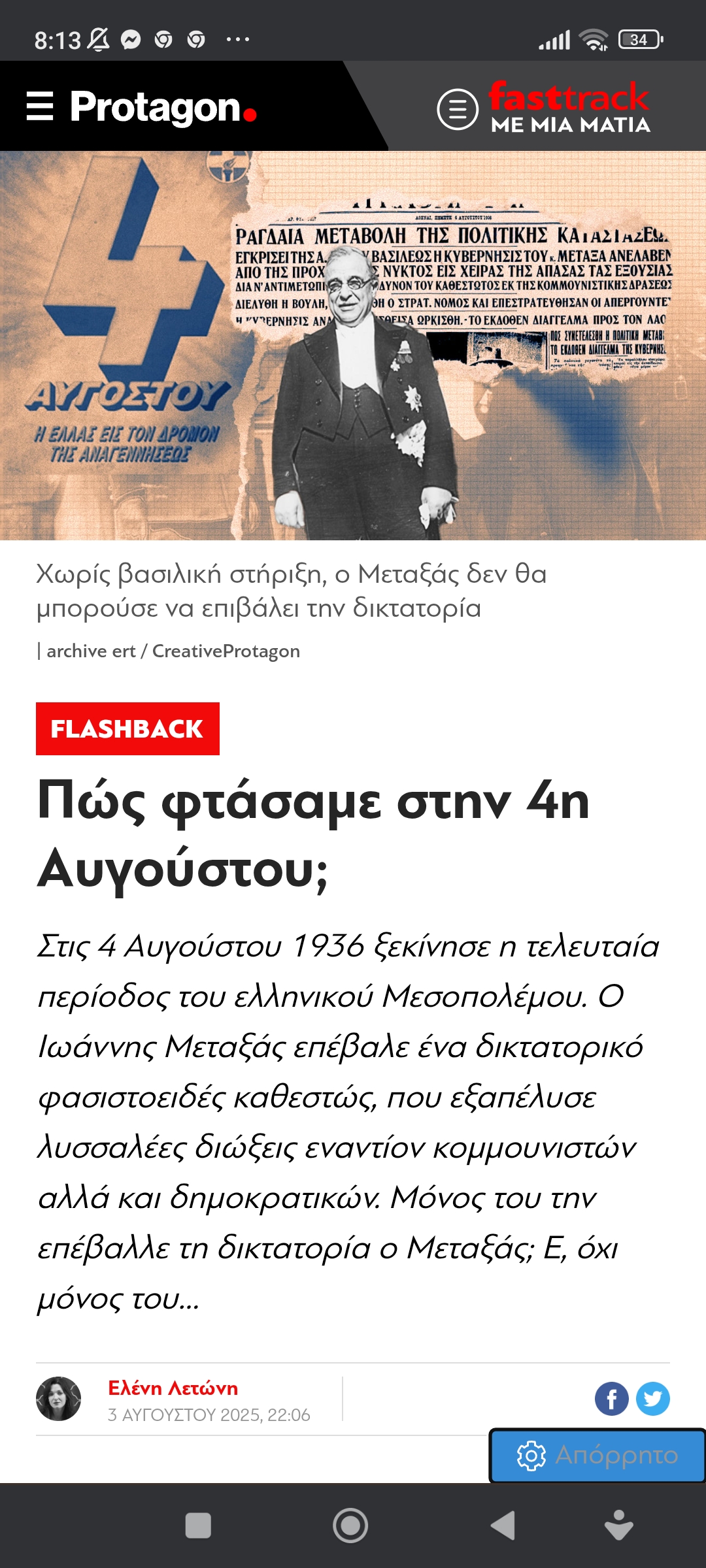 Ιστορία Κοινωνία / Πολιτικήκαι έτσι ο Μεταξάς εδραίωσε το καθεστώς της 4ης Αυγούστου Πέτρος Ιωάννου8 μήνες ago8 μήνες ago01 mins 4/8/2025 Πώς φτάσαμε στην 4η Αυγούστου; Πλοήγηση άρθρων Previous: Η καλημέρα του ΑρκάNext: Πώς αναγνωρίζεις ένα φασίστα Αφήστε μια απάντηση Ακύρωση απάντησηςΗ ηλ. διεύθυνση σας δεν δημοσιεύεται. Τα υποχρεωτικά πεδία σημειώνονται με *Σχόλιο * Όνομα * Email * Ιστότοπος Αποθήκευσε το όνομά μου, email, και τον ιστότοπο μου σε αυτόν τον πλοηγό για την επόμενη φορά που θα σχολιάσω.