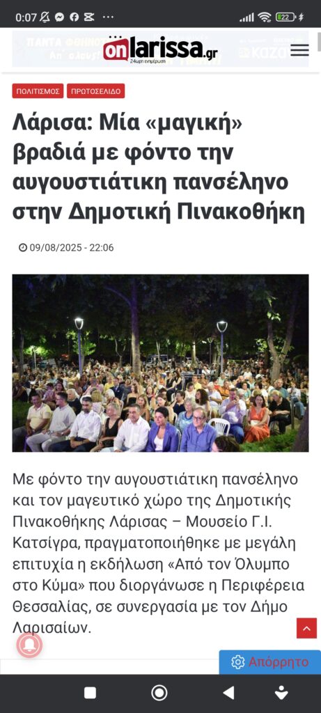 Εκπαίδευση / Πολιτισμός Θεσσαλία / Λάρισα“Απ’ τον Όλυμπο στο κύμα”. Μαγευτική βραδιά με νότες, στην Πινακοθήκη Λάρισας Πέτρος Ιωάννου8 μήνες ago8 μήνες ago01 mins 9/8/2025 https://www.onlarissa.gr/2025/08/09/larisa-mia-magiki-vradia-me-fonto-tin-avgoustiatiki-panselino-stin-dimotiki-pinakothiki Πλοήγηση άρθρων Previous: Πρόσφυγας απ’ το Αφγανιστάν μαθαίνει δωρεάν χειρισμό υπολογιστών σε γυναίκες της πατρίδας τουNext: “Ποίηση κι ελληνικό τραγούδι, το κερδισμένο στοίχημα” με τον συνθέτη Δημήτρη Παπαδημητρίου και την ομάδα του, στην Πινακοθήκη Λάρισας (90λεπτο βίντεο) Αφήστε μια απάντηση Ακύρωση απάντησηςΗ ηλ. διεύθυνση σας δεν δημοσιεύεται. Τα υποχρεωτικά πεδία σημειώνονται με *Σχόλιο * Όνομα * Email * Ιστότοπος Αποθήκευσε το όνομά μου, email, και τον ιστότοπο μου σε αυτόν τον πλοηγό για την επόμενη φορά που θα σχολιάσω.