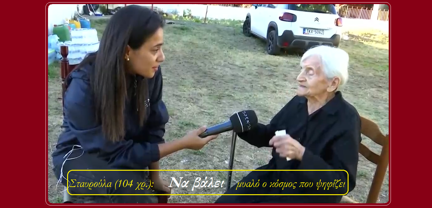 Βίντεοκι όμως η Σταυρούλα, γιαγιούλα που αθροίζει, εμπειρίες αιώνα και τεσσάρων χρόνων, με σκέψεις διαυγείς, βάζει γυαλιά, σ’ όλους μας Πέτρος Ιωάννου3 έτη ago2 έτη ago01 mins Πλοήγηση άρθρων Previous: ”40 Παλληκάρια από τη Λεβαδειά” το κοινό αποθεώνει τον Βασίλη Λέκκα στη Λάρισα και καλά κάνει. Πάντα, πρέπει να λέει ναι στην ποιότητα!Next: Γιαγιά 104 ετών από τη Θεσσαλία: «Να βάλει μυαλό ο κόσμος που ψηφίζει – Παίρνουν λεφτά από την ΕΕ και τα εξαφανίζουν» (upd) Αφήστε μια απάντηση Ακύρωση απάντησηςΗ ηλ. διεύθυνση σας δεν δημοσιεύεται. Τα υποχρεωτικά πεδία σημειώνονται με *Σχόλιο * Όνομα * Email * Ιστότοπος Αποθήκευσε το όνομά μου, email, και τον ιστότοπο μου σε αυτόν τον πλοηγό για την επόμενη φορά που θα σχολιάσω.