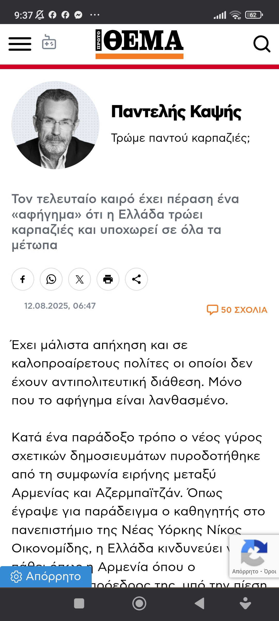 ΑπόψειςΠολλοί νιώθουμε πως τρώμε διεθνώς καρπαζιές. Ο Παντελής Καψής διαφωνεί Πέτρος Ιωάννου8 μήνες ago8 μήνες ago01 mins 13/8/2025 https://www.protothema.gr/blogs/padelis-kapsis/article/1681325/trome-padou-karpazies Πλοήγηση άρθρων Previous: Σκίτσο του Κώστα Γρηγοριάδη για την Εφημερίδα των ΣυντακτώνNext: …στην εποχή και τη γενιά του “τώρα” Αφήστε μια απάντηση Ακύρωση απάντησηςΗ ηλ. διεύθυνση σας δεν δημοσιεύεται. Τα υποχρεωτικά πεδία σημειώνονται με *Σχόλιο * Όνομα * Email * Ιστότοπος Αποθήκευσε το όνομά μου, email, και τον ιστότοπο μου σε αυτόν τον πλοηγό για την επόμενη φορά που θα σχολιάσω.